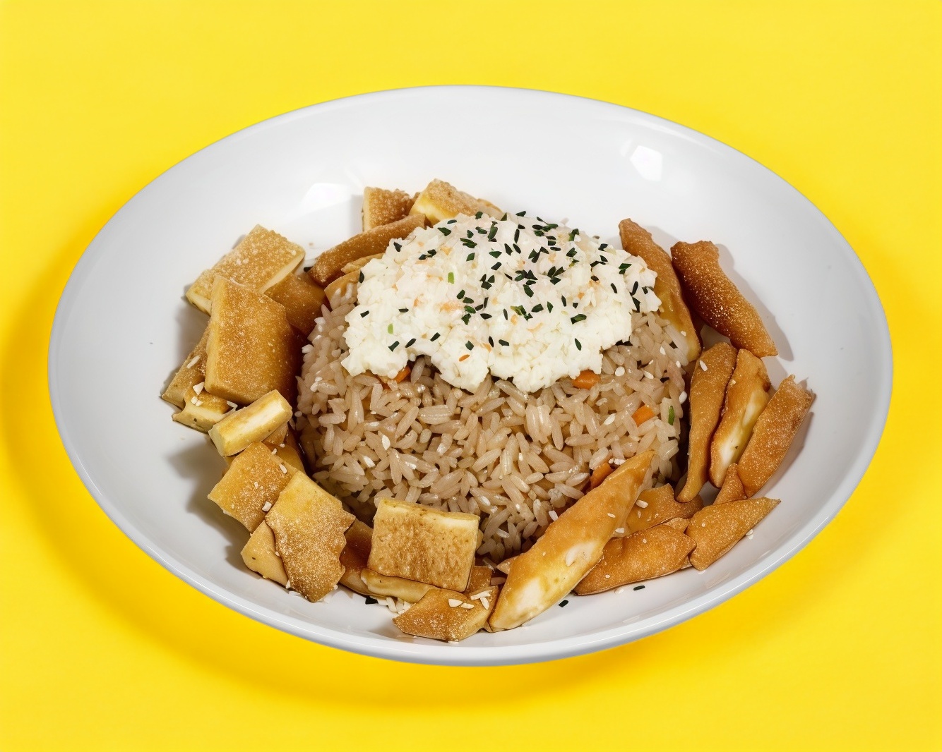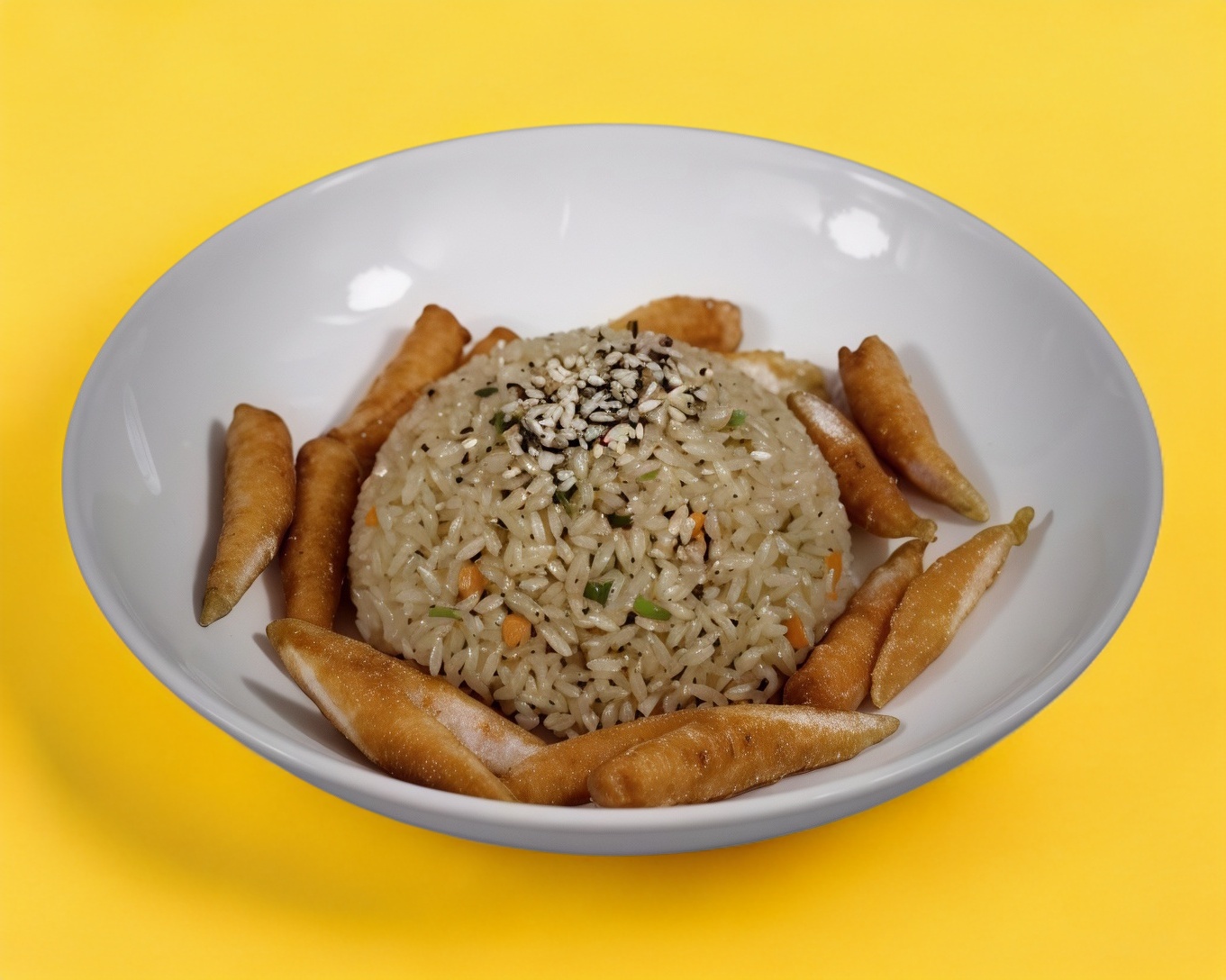 Arroz frito con verduras, acompañado con trozos de camarón empanizado.