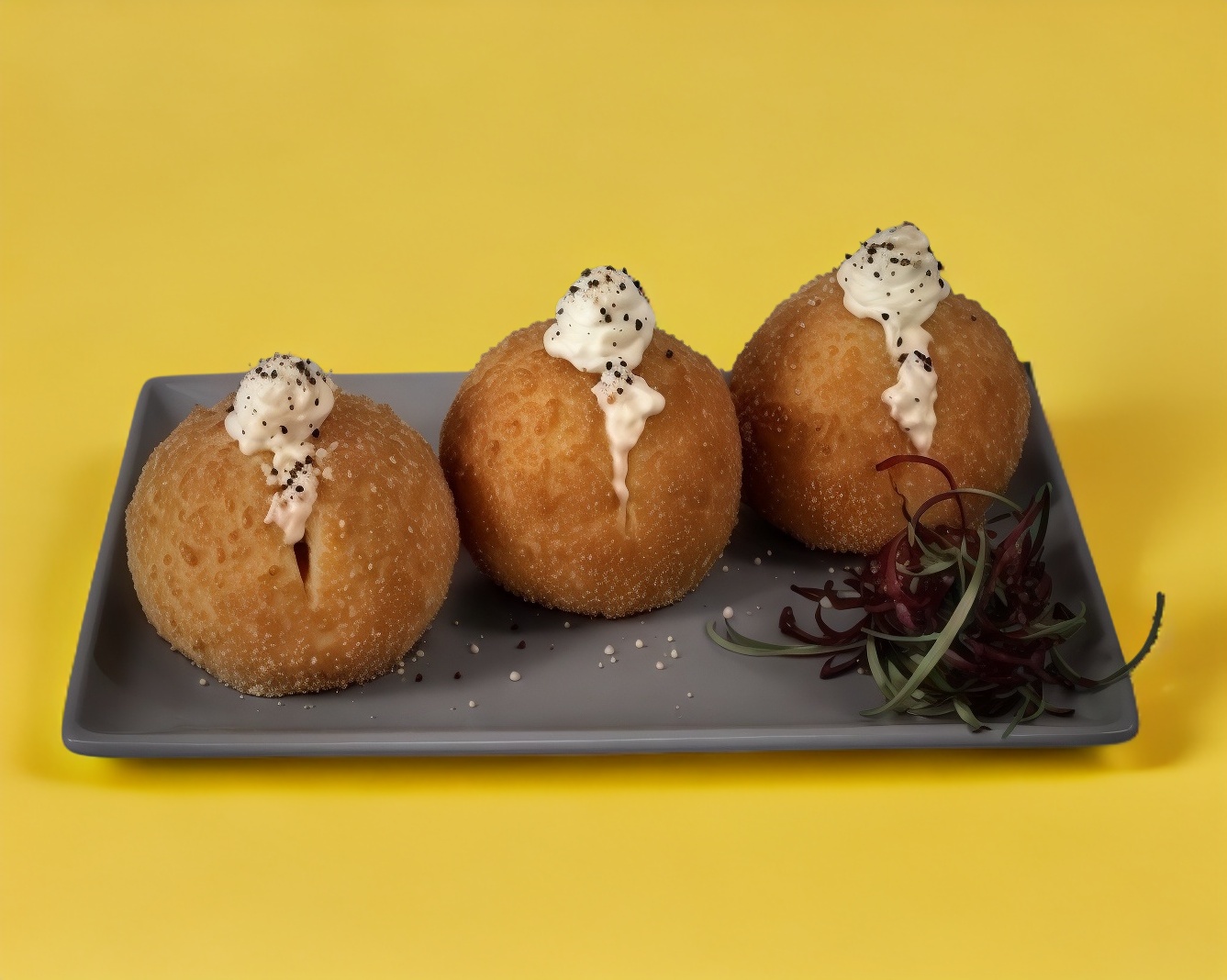Bola de arroz empanizada, rellena de tampico y aguacate.
