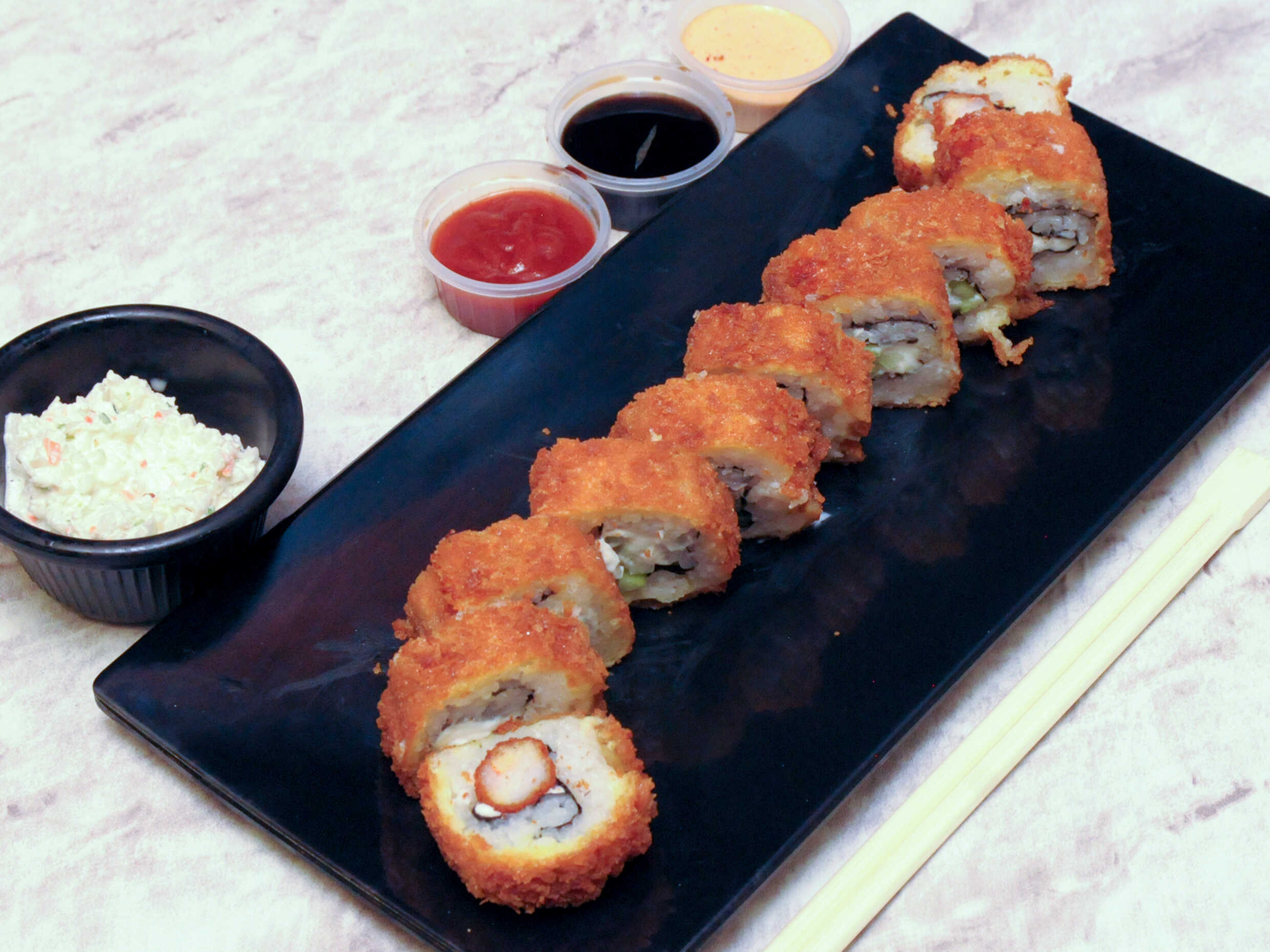 Por fuera Pollo empanizado con Tampico, Por dentro camarón empanizado, aguacate y Philadelphia.