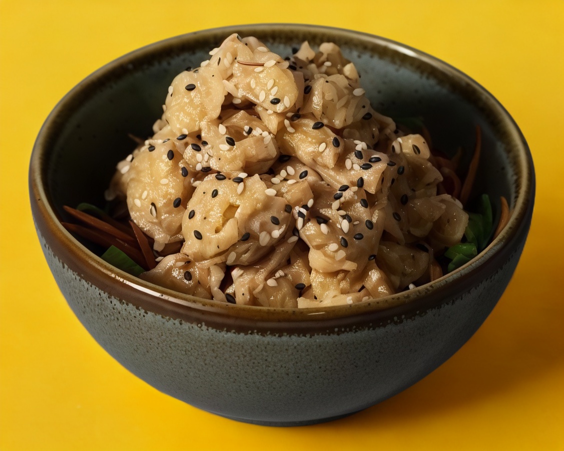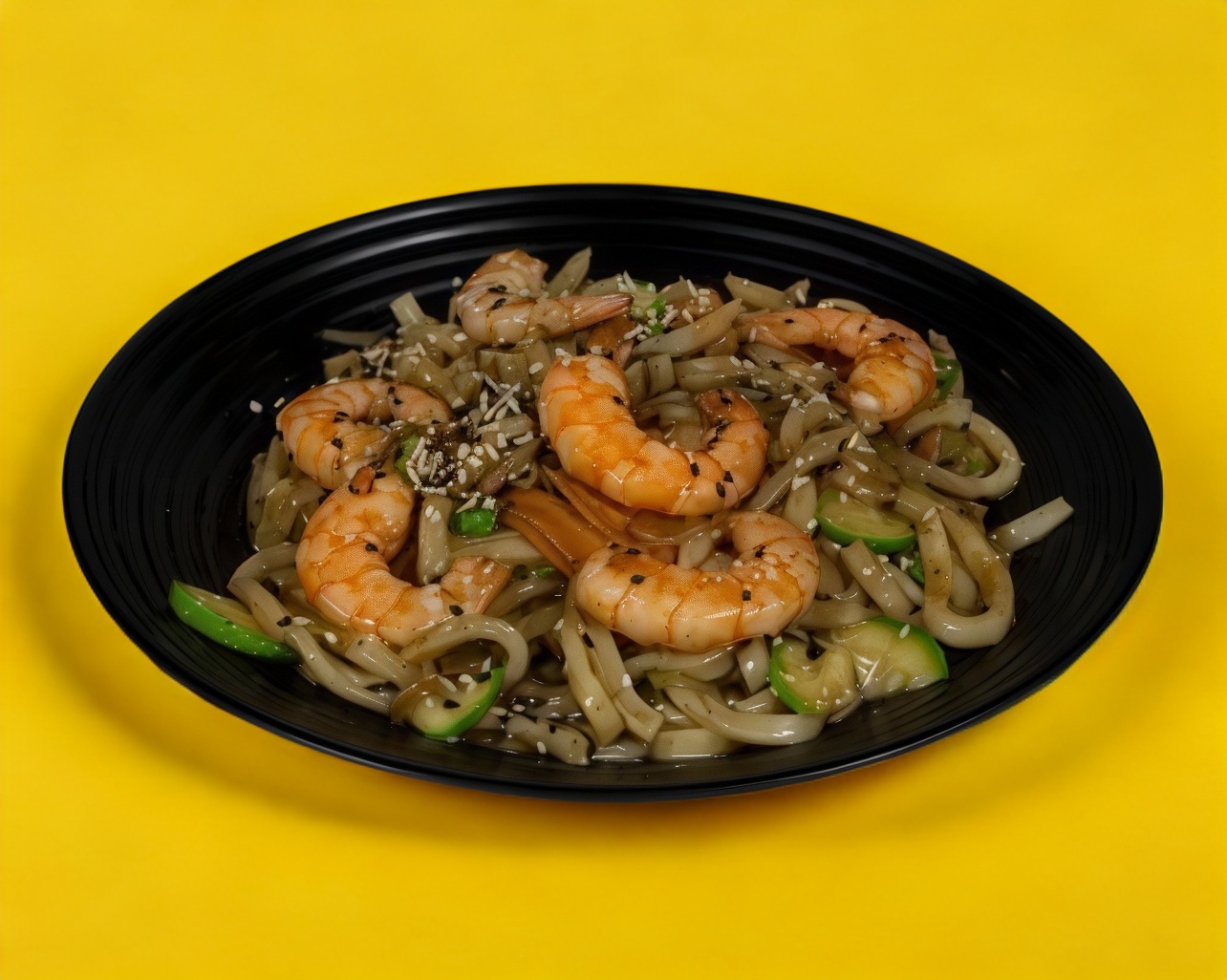 Fideo grueso Udon zasonado con verduras y camaron, bañado en salsa Spicy