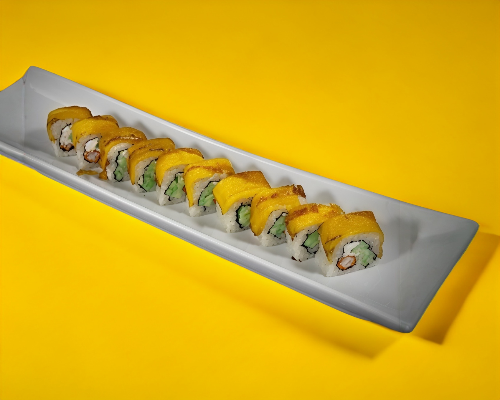 Por fuera Plátano macho frito, Por dentro Philadelphia, camarón empanizado y pepino.