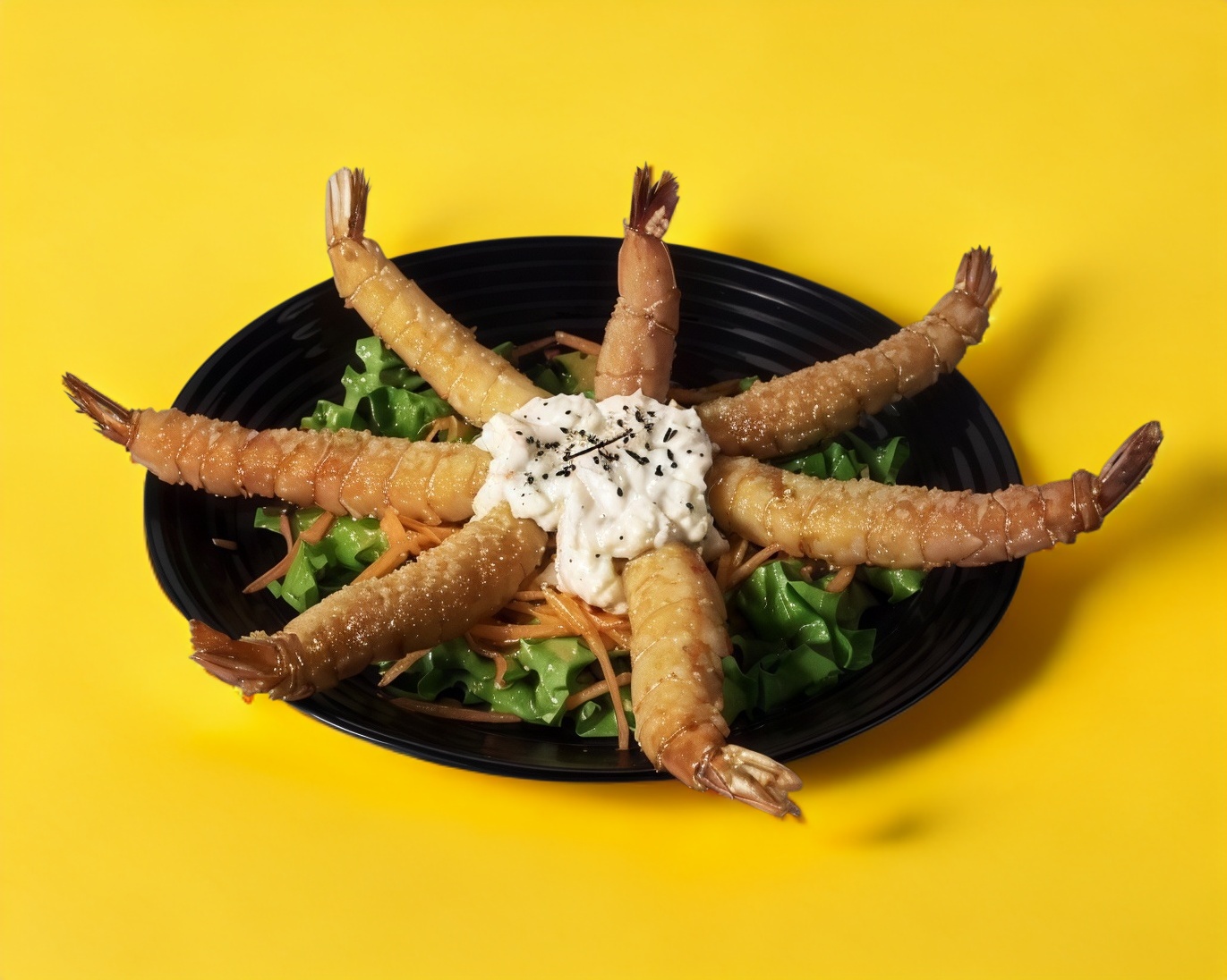 Trozos de camarones tempurizados, bañados con salsa chipotle y cama de ensalada.