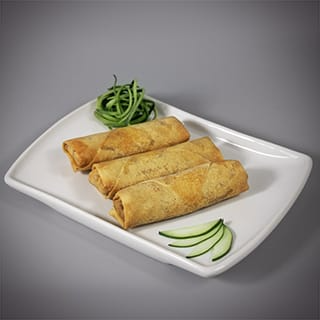 Pasta rellena de vegetales y pollo, formado en rollo y fritos.