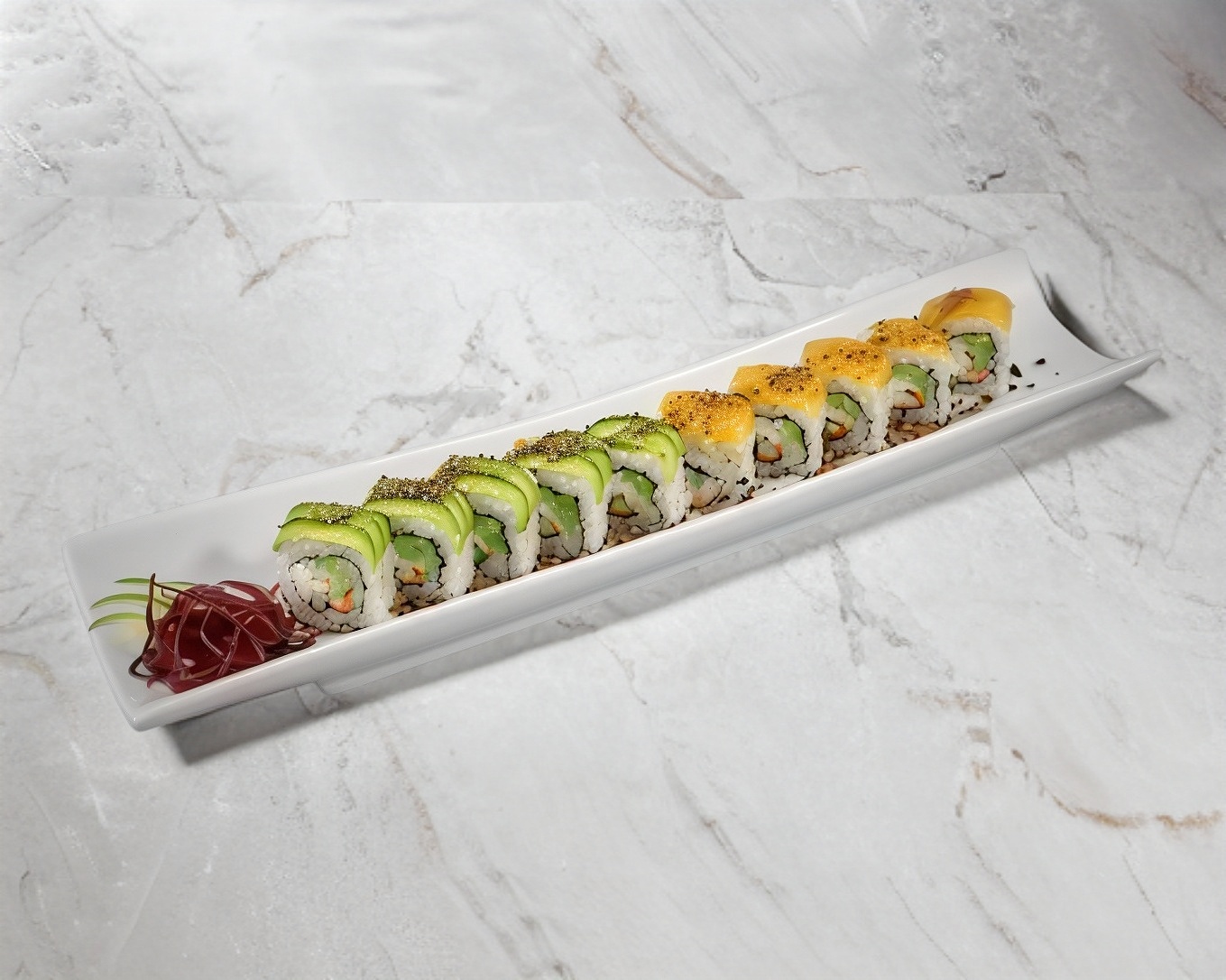 Relleno de Camarón empanizado, philadelphia y pepino, Cubierto de durazno o mango (segun la temporada), aguacate y nuez caramelizada