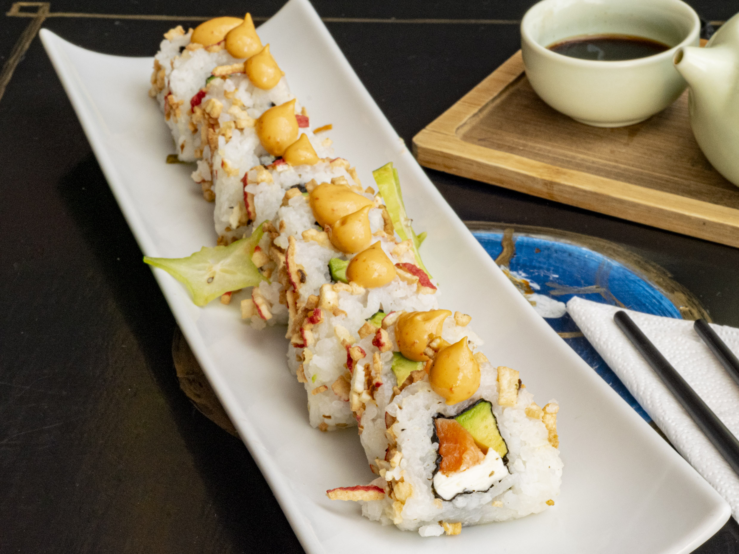 Pescado empanizado, aguacate y queso crema por dentro, cebollín tempurizado y salsa sirasha por fuera.