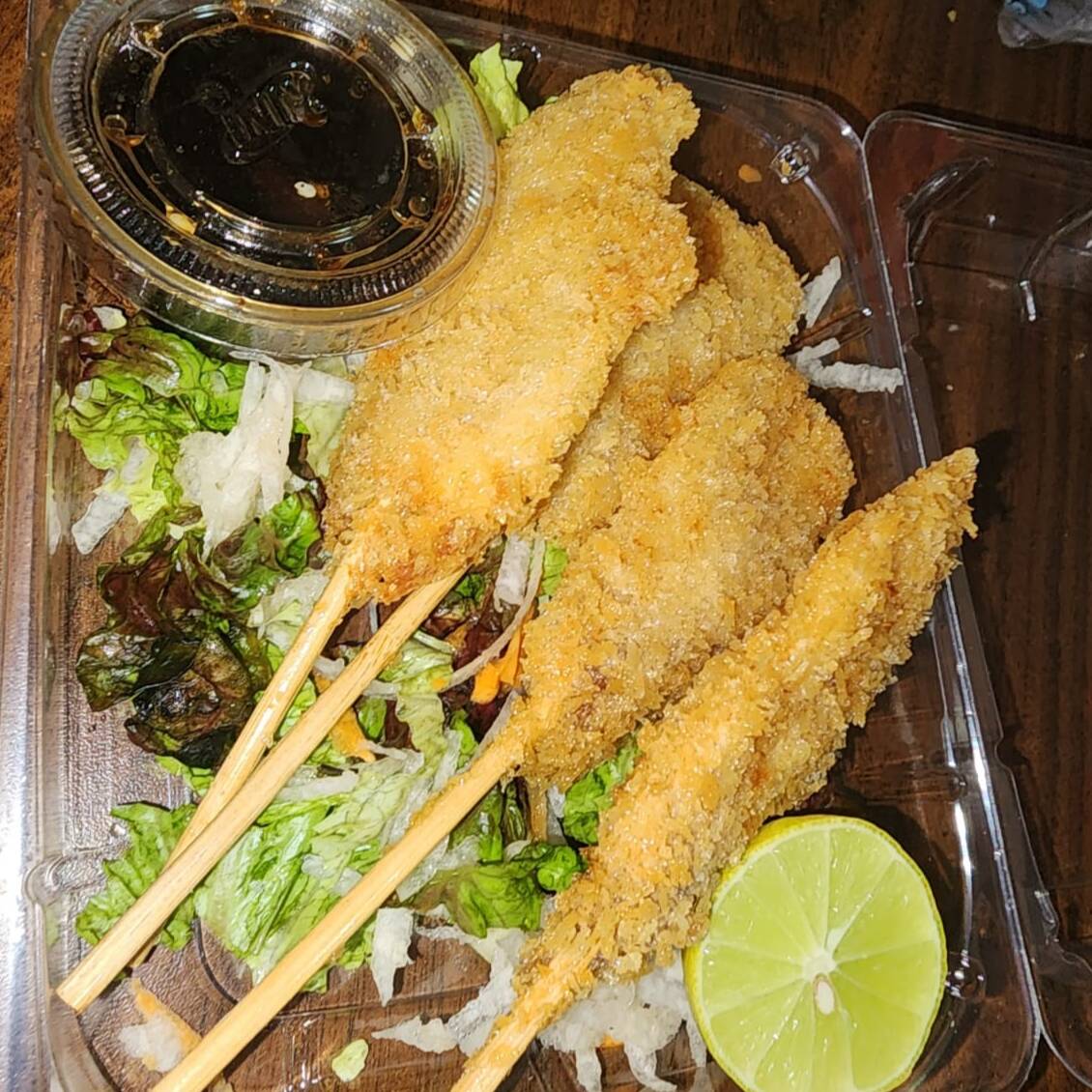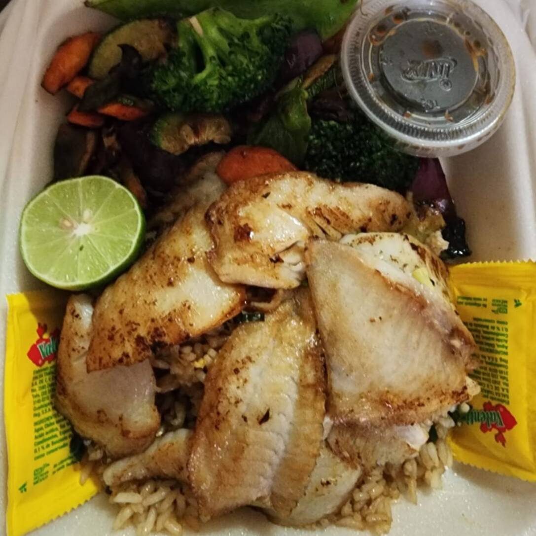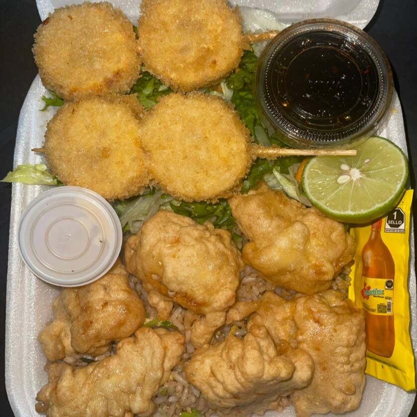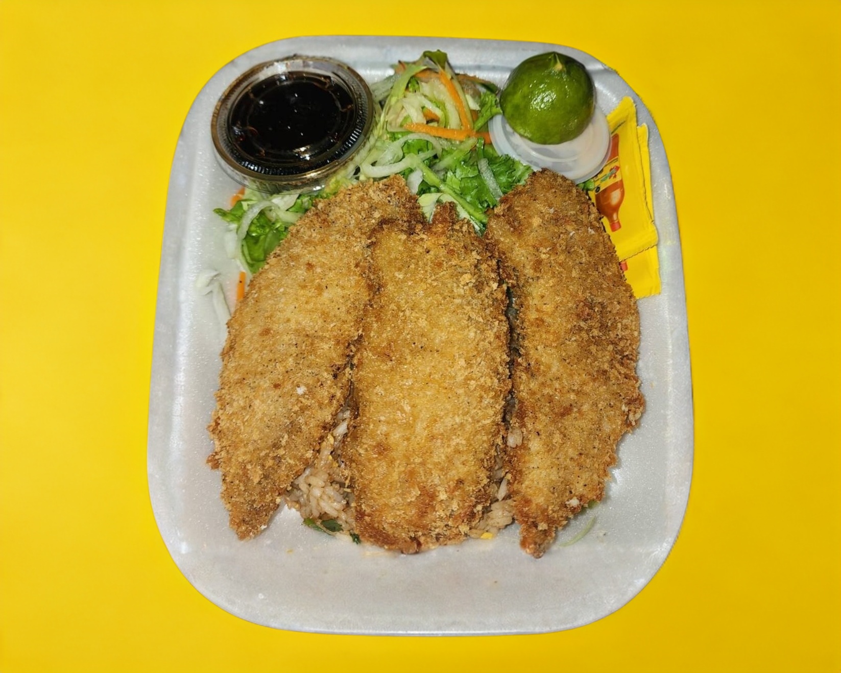 3 pz de pescado empanizado, acompañado de arroz yakimeshi y ensalada.