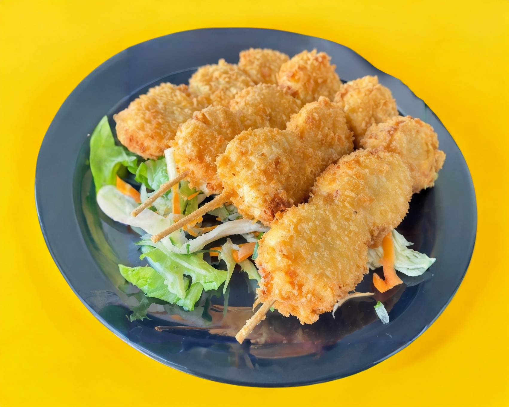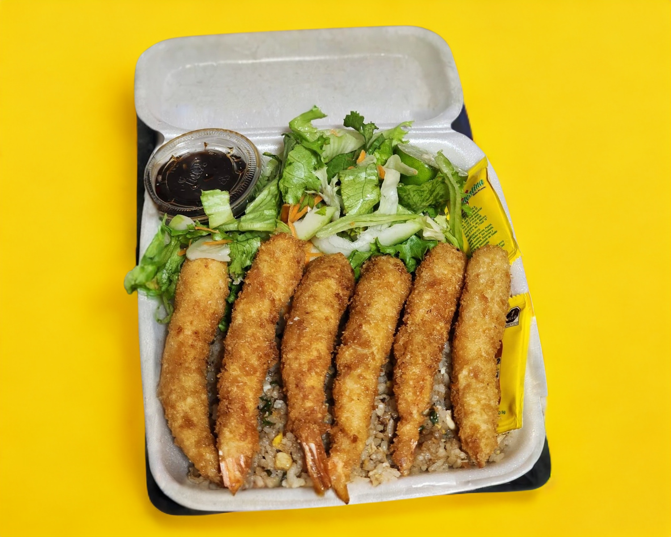 Camarones empanizados, acompañados de arroz yakimeshi y ensalada.