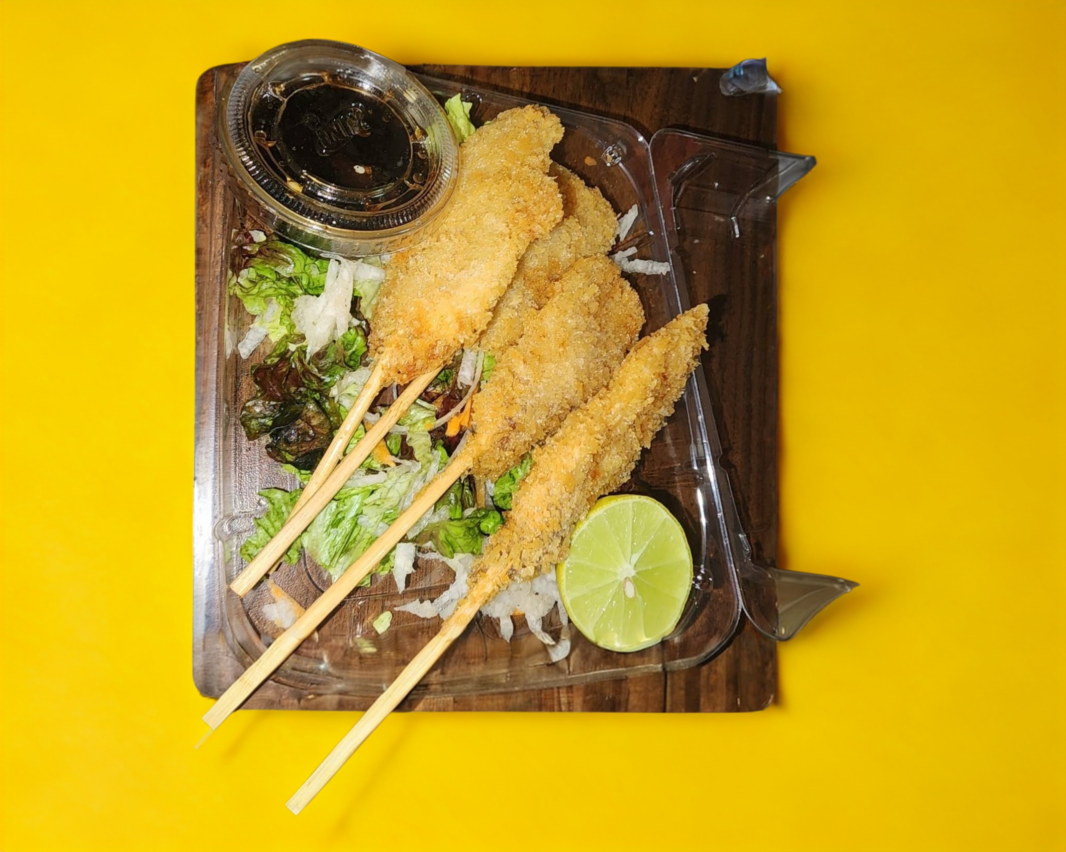 Pollo o pescado capeado, acompañado de yakimeshi, ensalada y dos brochetas de plátano (Incluye una bebida)