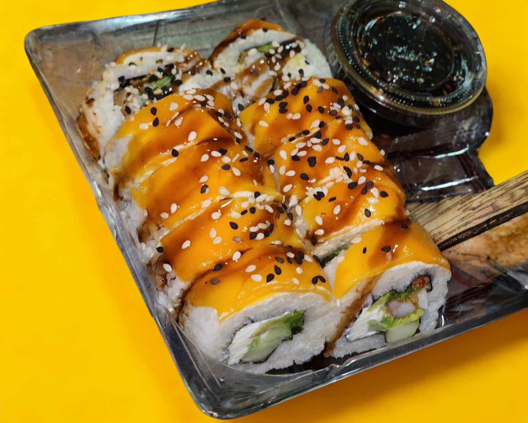 Por dentro camarón empanizado, queso, pepino y aguacate, envuelto en mango. (10pz)