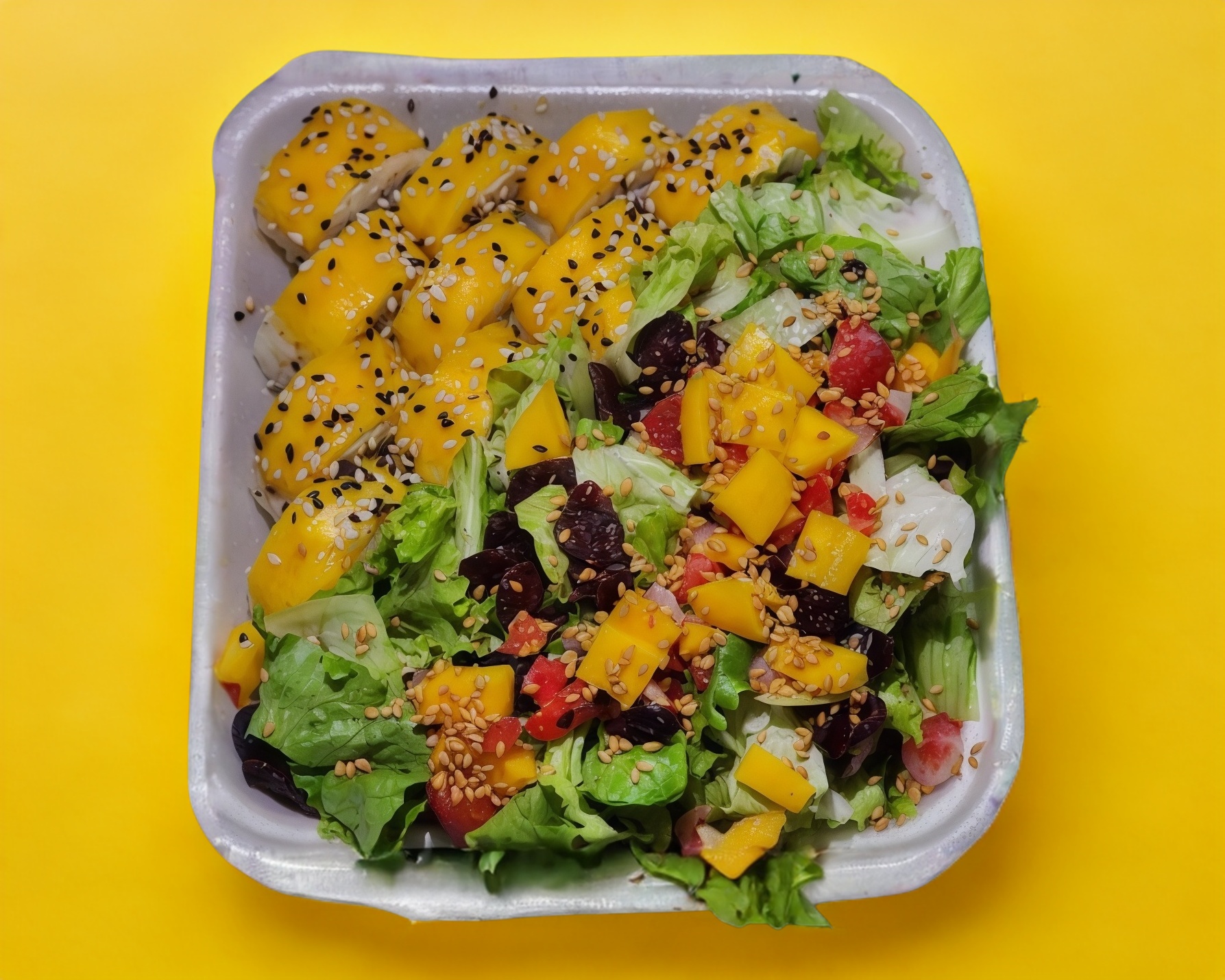 Ensalada acompañada de frutos rojos, frutos secos, mango y un sushi sencillo de su elección.