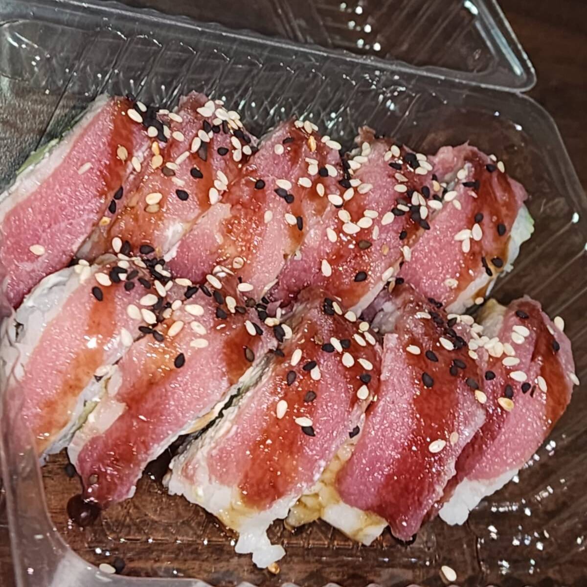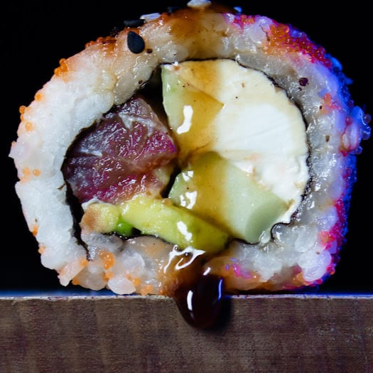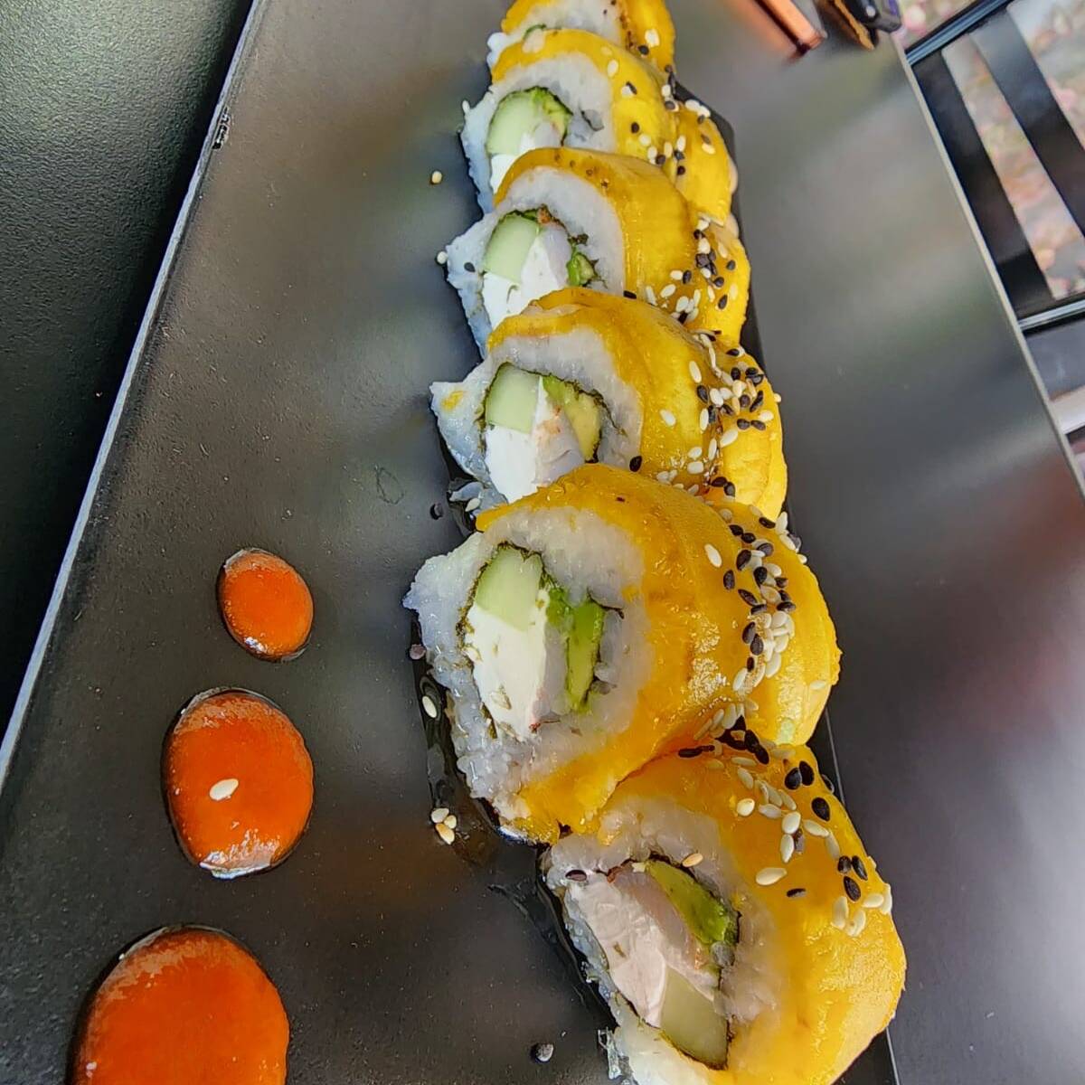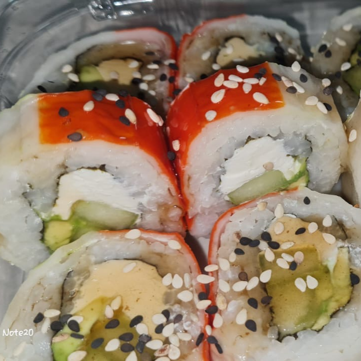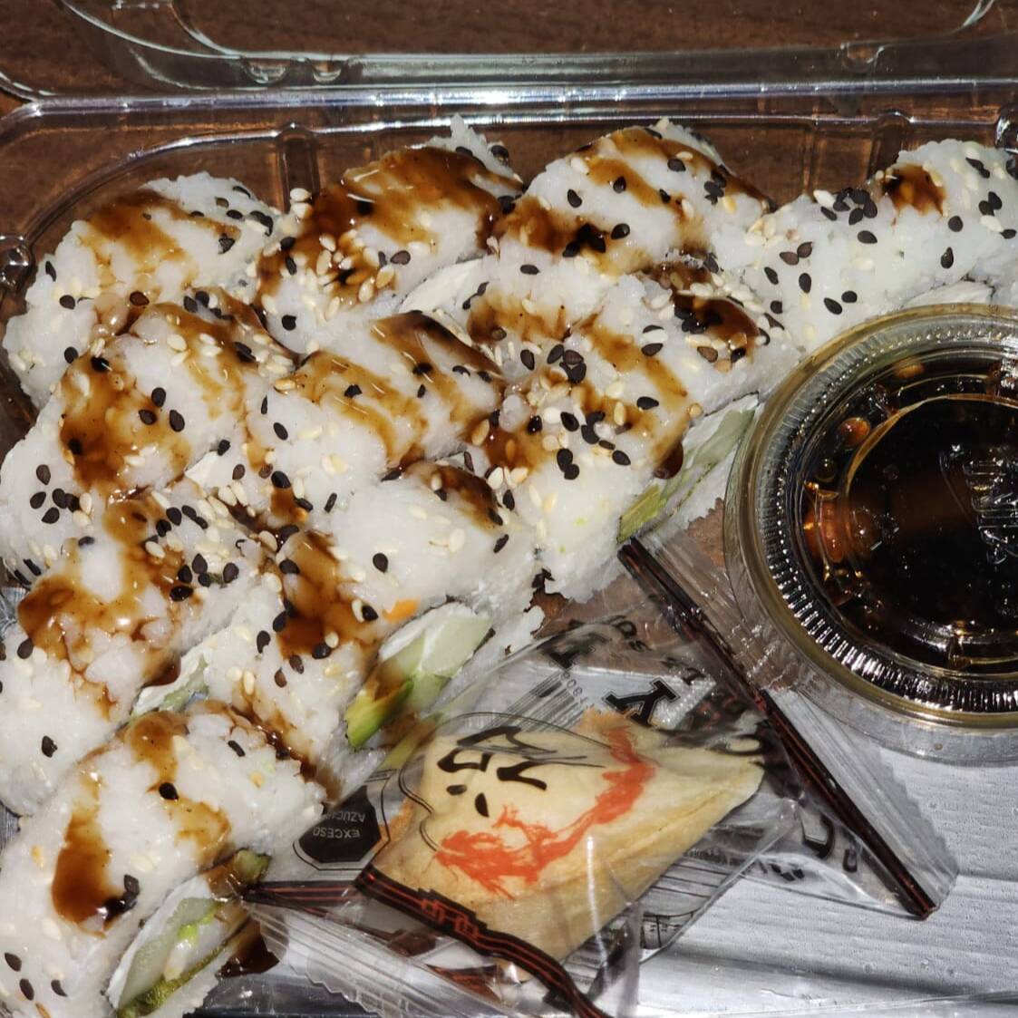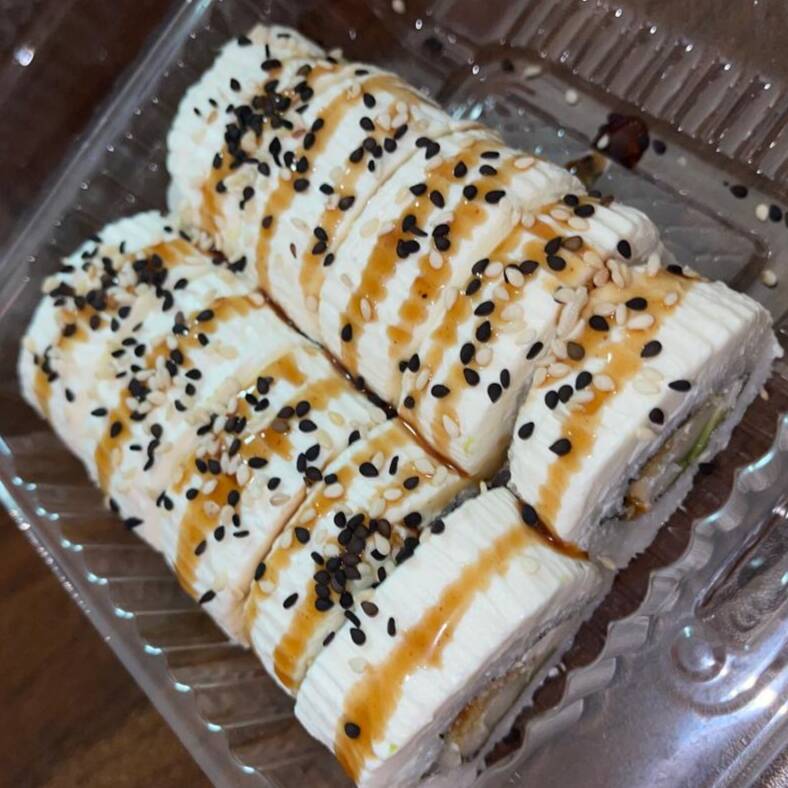 Por dentro queso filadelfia, pepino, aguacate y tampico, por fuera envuelto en ajonjoli.