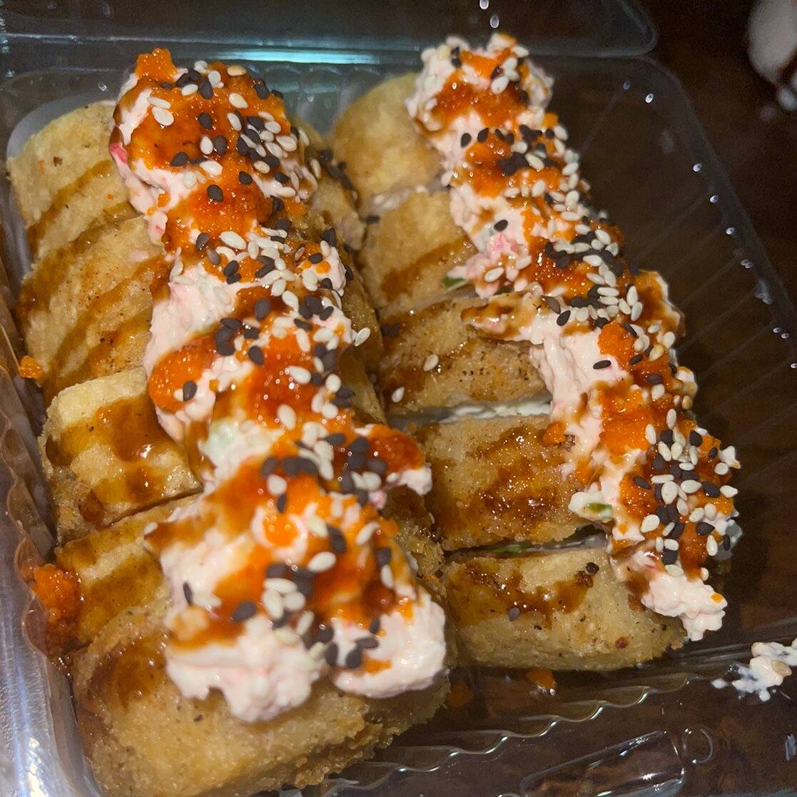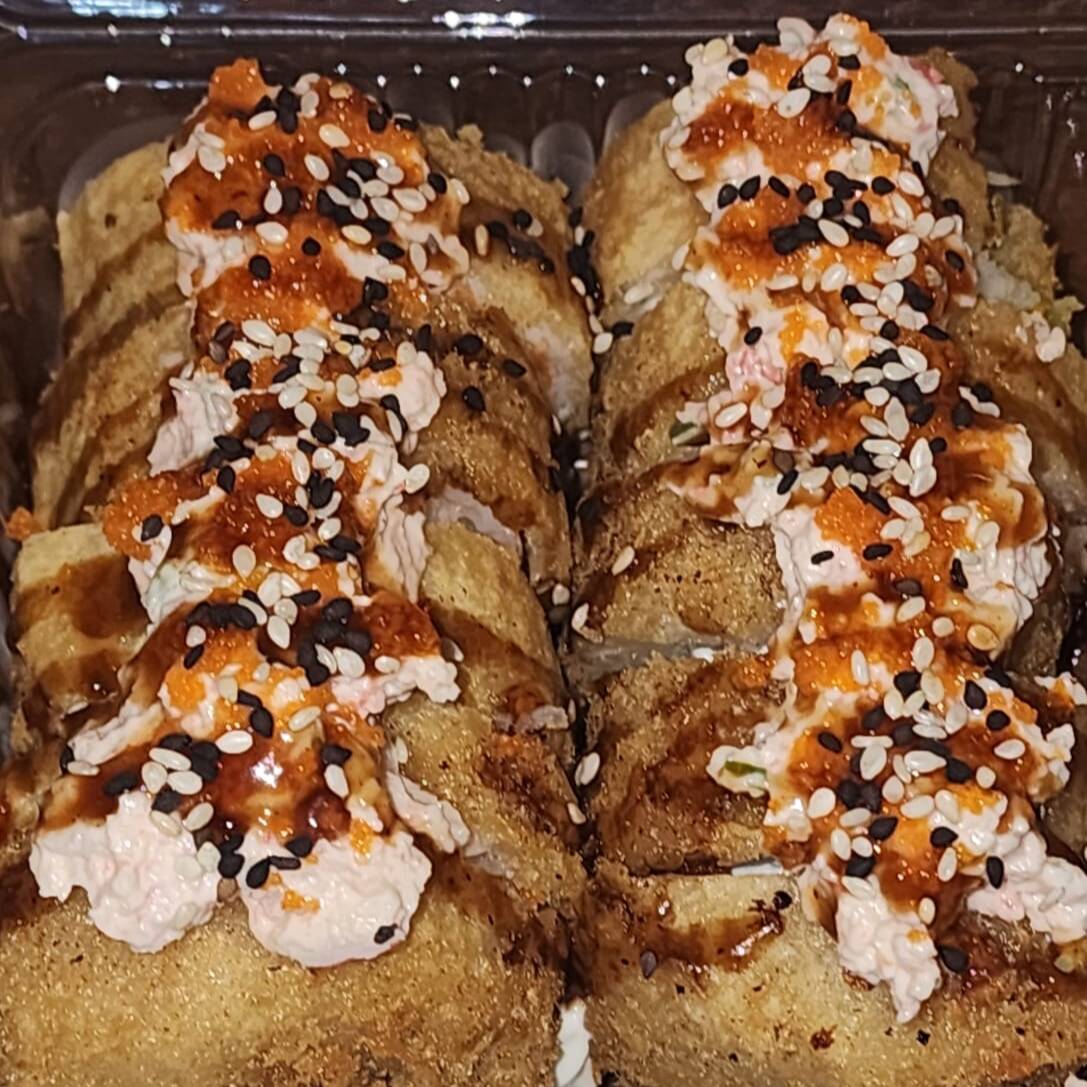 Por dentro queso, pepino y aguacate, envuelto en pescado, empanizado, acompañado de tampico y masago. (10pz)