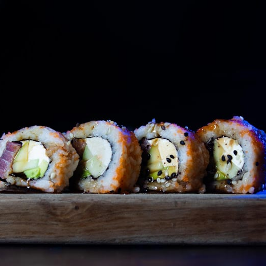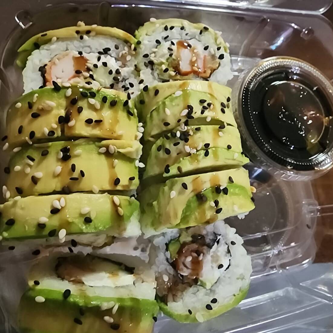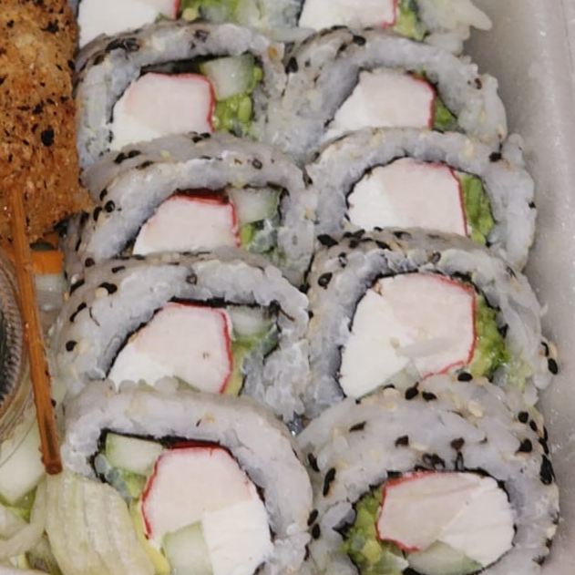 Por dentro surimi empanizado, queso, pepino, por fuera envuelto en aguacate.
