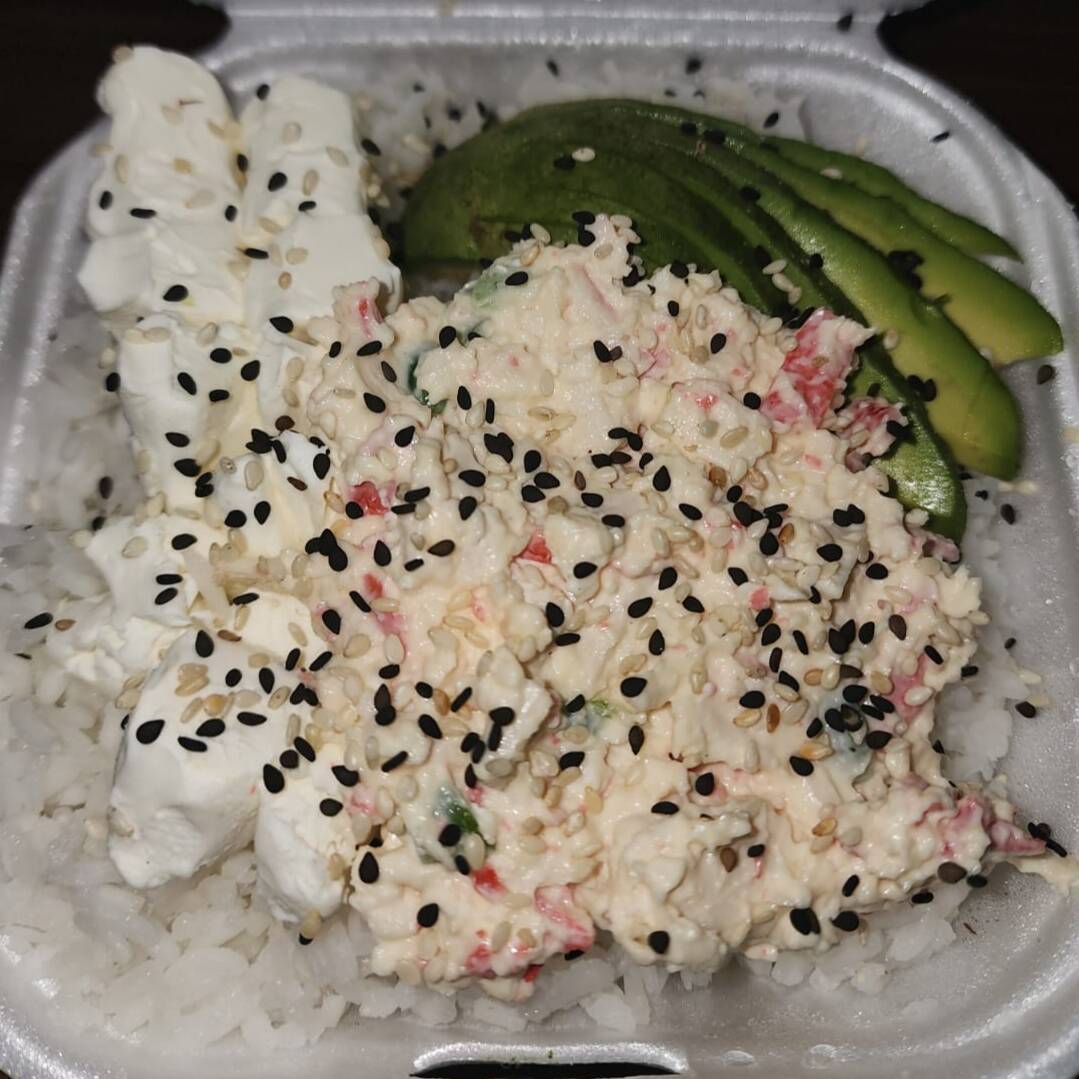 Arroz al vapor acompañado de filadelfia, aguacate y tampico.