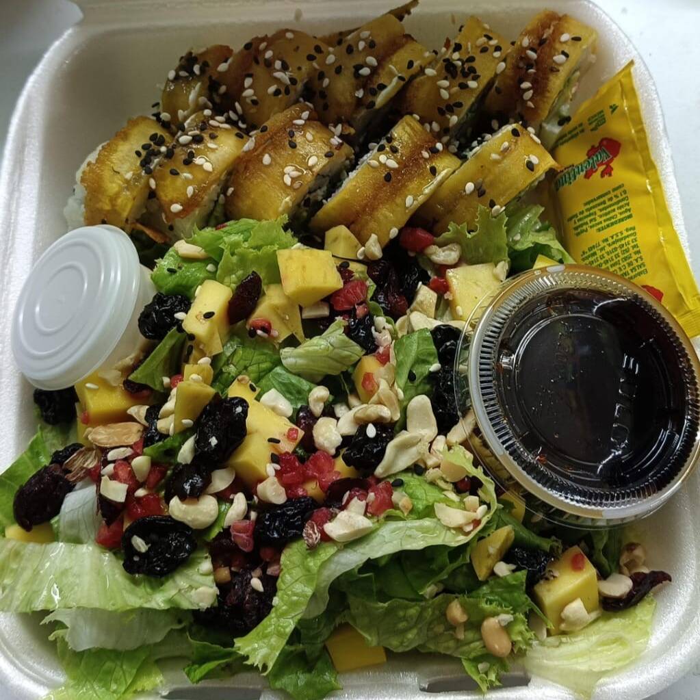 Ensalada acompañada de frutos secos, frutos rojos, mango, y el sushi especial de tu elección.