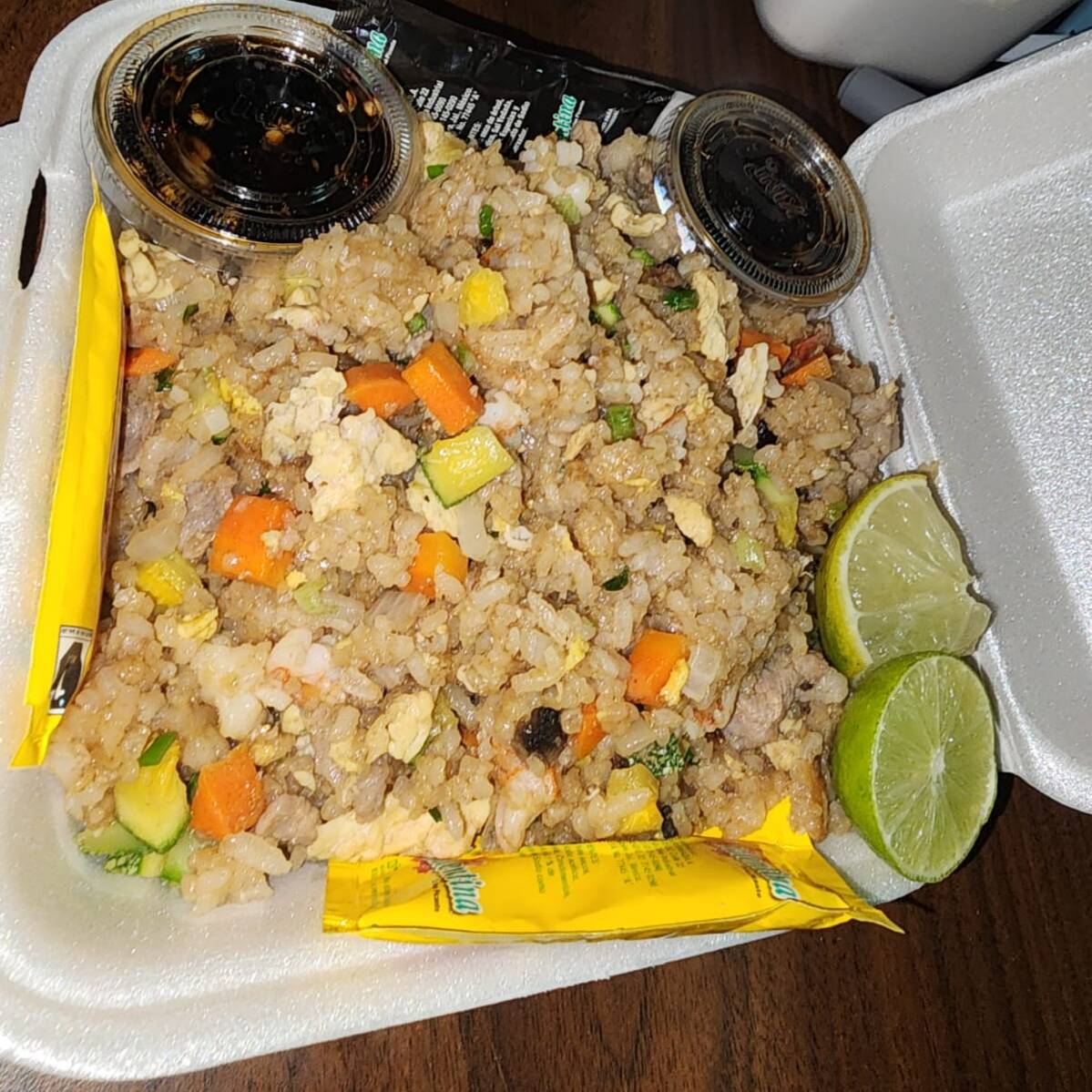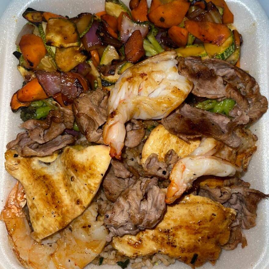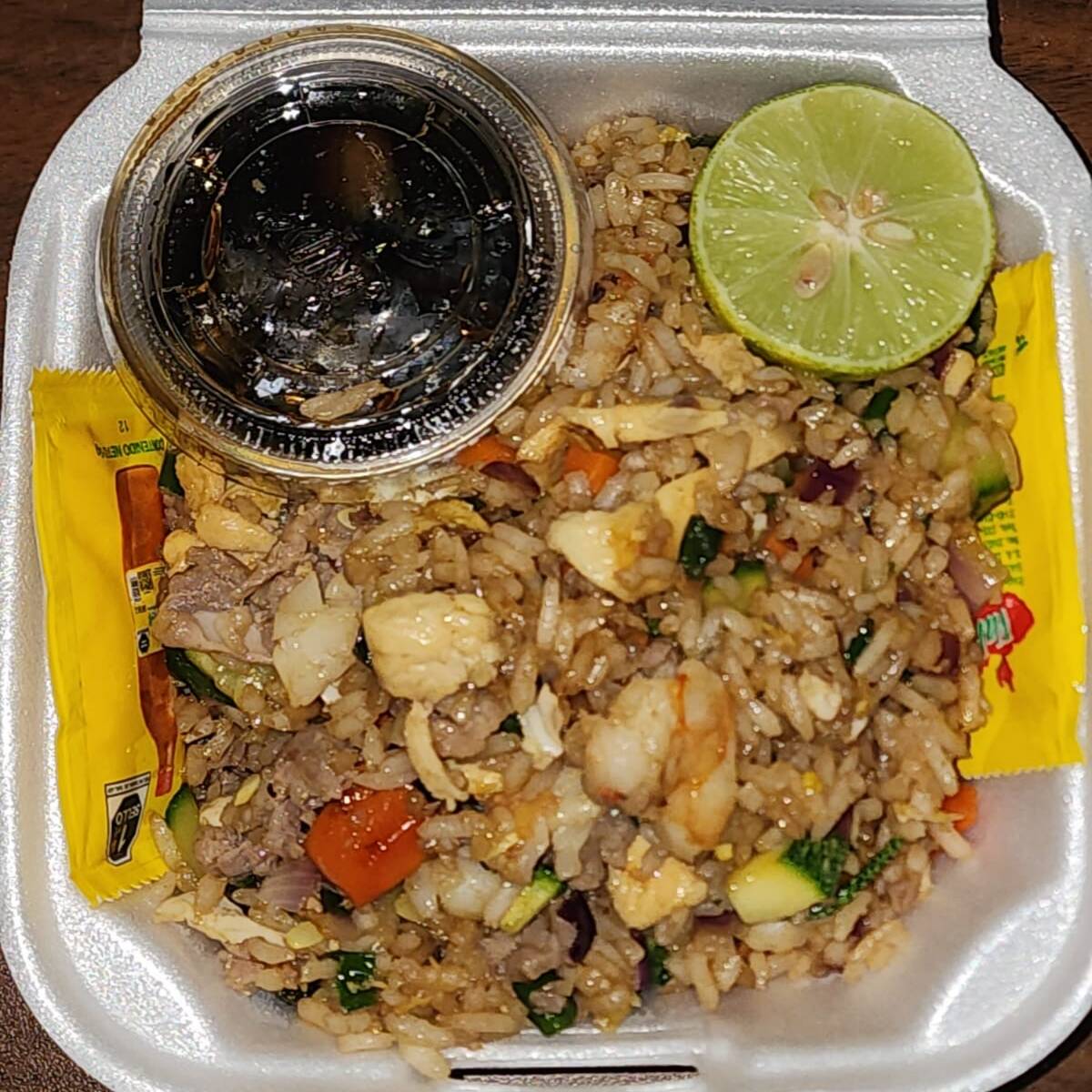 Arroz frito acompañado de verduras, pollo, res y camarón.