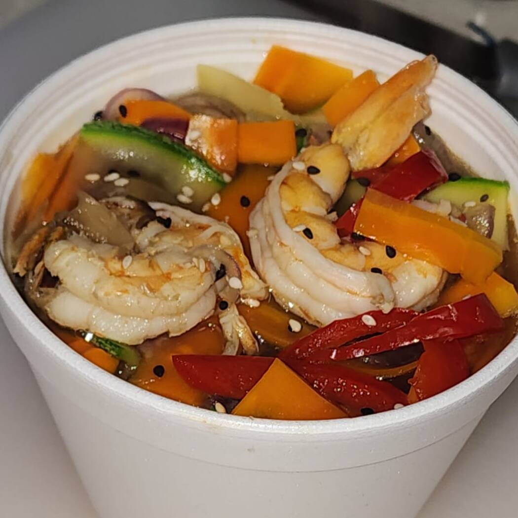 Sopa de res, pollo y camarón, con fondo de verduras. Medio Lt.