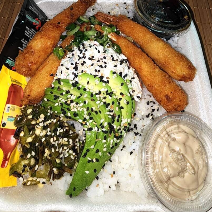 Arroz al vapor acompañado de 4pz de camarones empanizados, chiles toreados, aguacate y tampico.