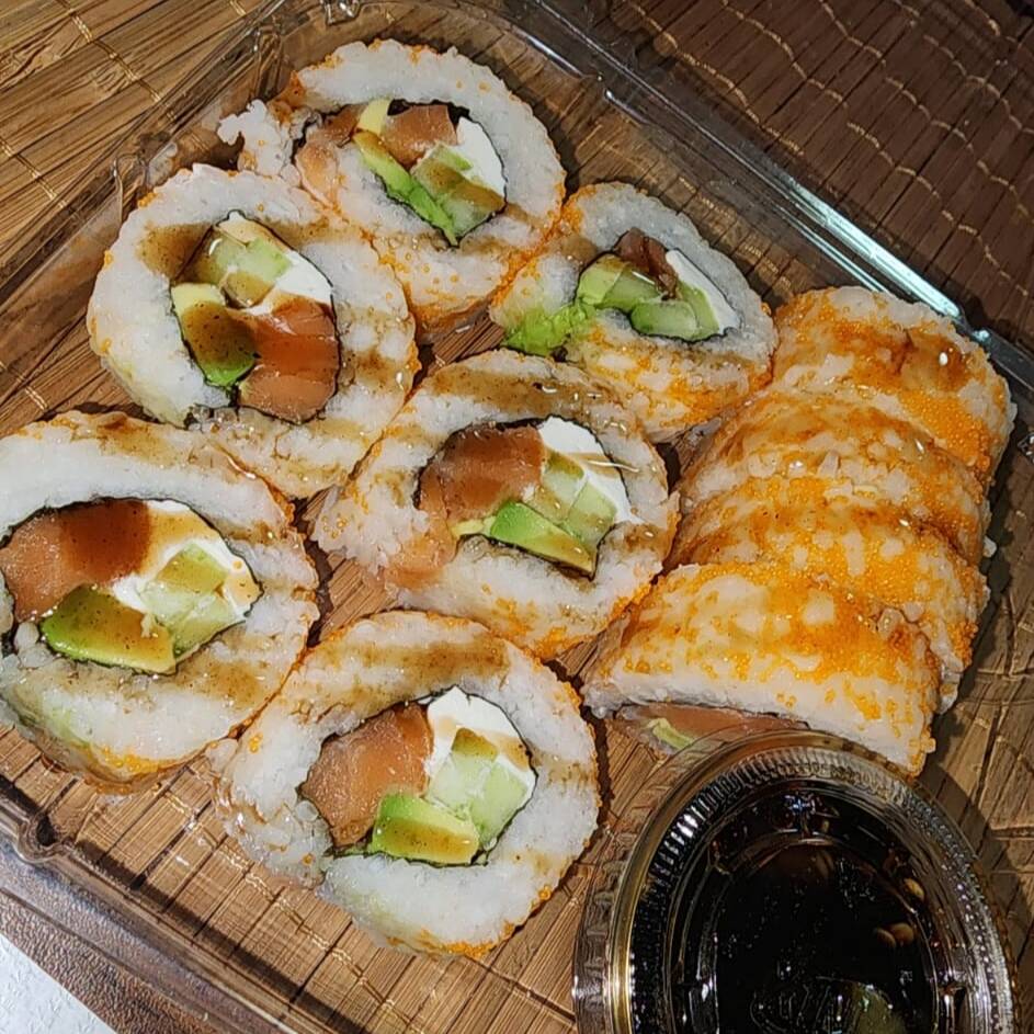 Por dentro queso filadelfia, pepino, aguacate y salmón por fuera envuelto en masago. (10pz)