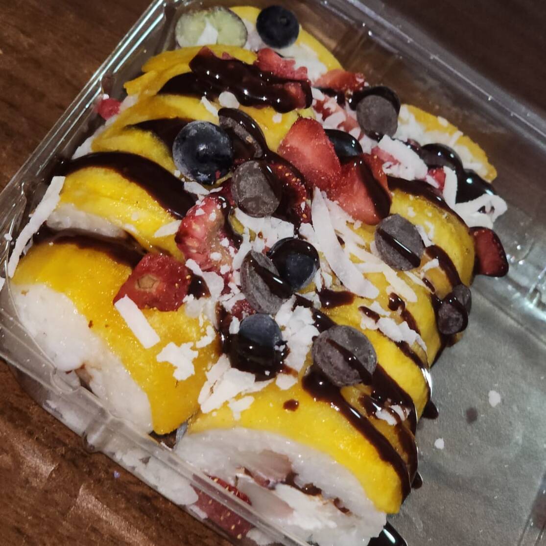 Rollo de sushi, por dentro frutos rojos, queso y chocolate envuelto en fresa.