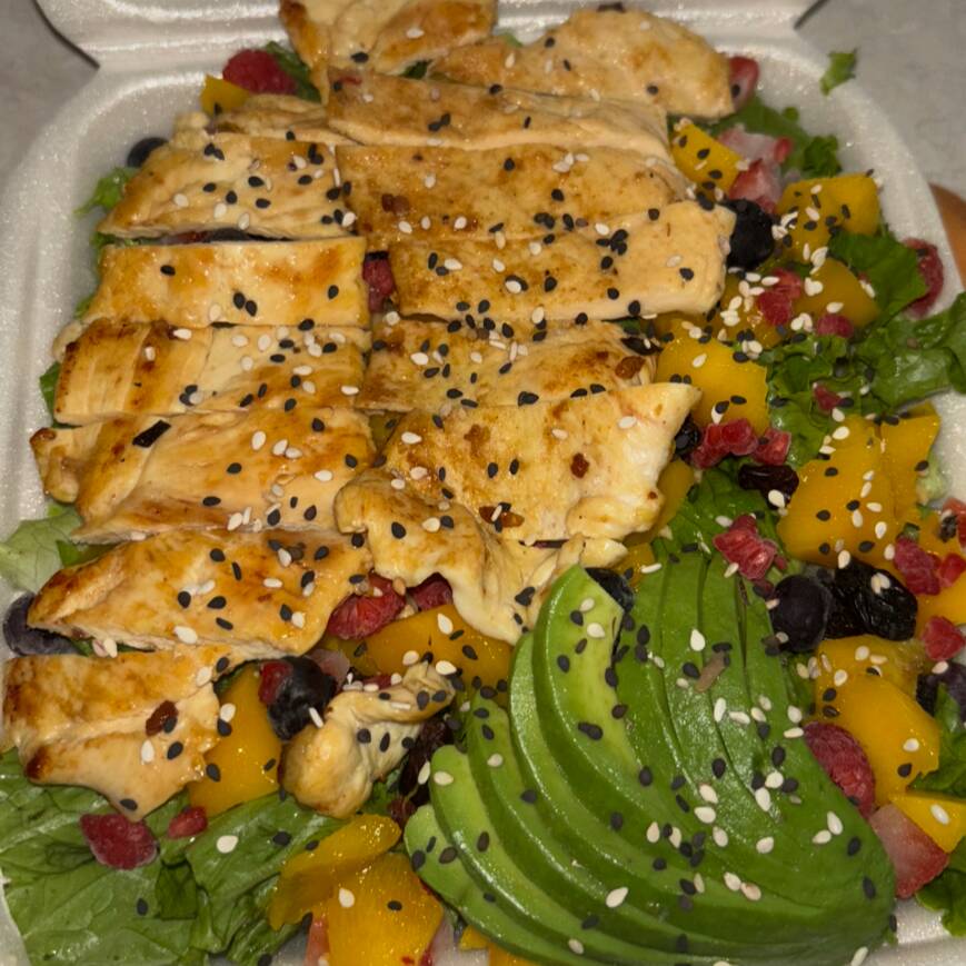 Ensalada acompañada de frutos rojos, frutos secos, mango, pechuga asada y aguacate.