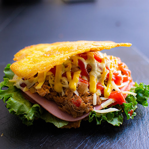 Arepa viuda, carne deshebrada, caraotas, queso, tajadas y aguacate.