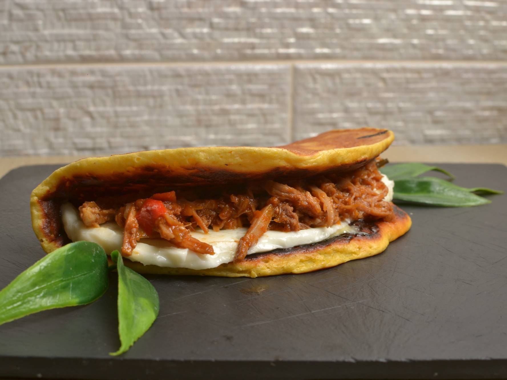 Arepa asada rellena de tinga de pollo y queso manchego rallado.