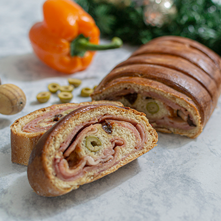 Arepa asada rellena de aguacate, pollo, mayonesa y queso manchego.
