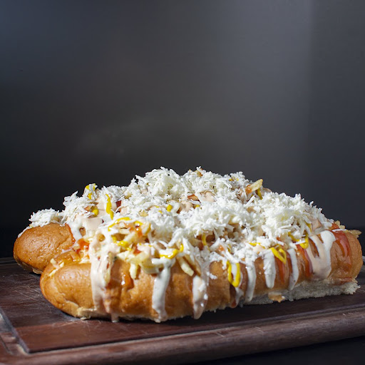 Hot dog venezolano con ensalada papas, salsas y queso.
