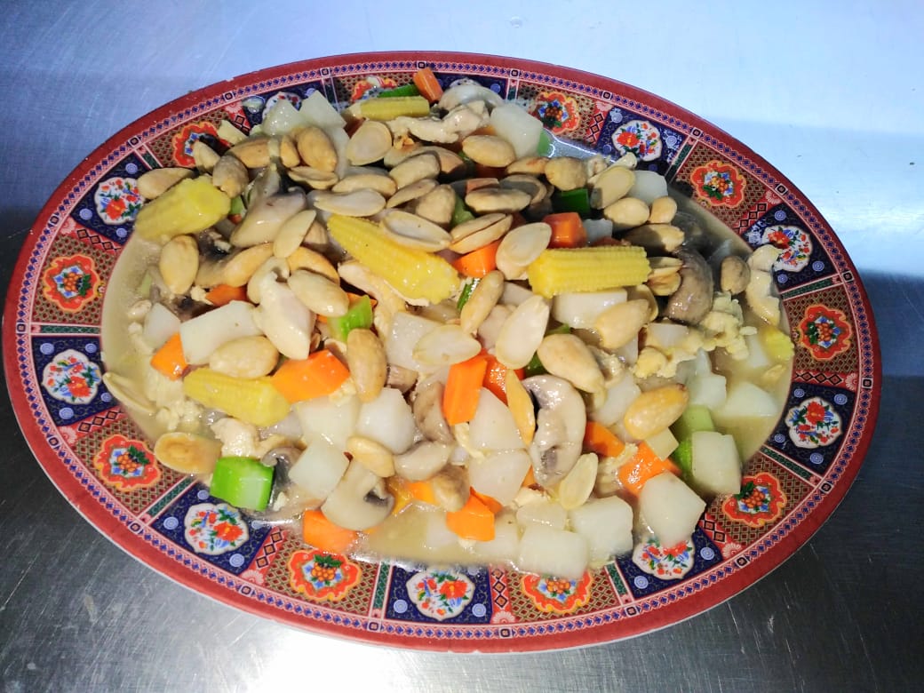 Clásico platillo de pechuga de pollo fileteado o Cerdo con cubos de zanahoria, jícama, apio, castaña de agua, elotito tierno y champiñones con crujientes nueces de la India.