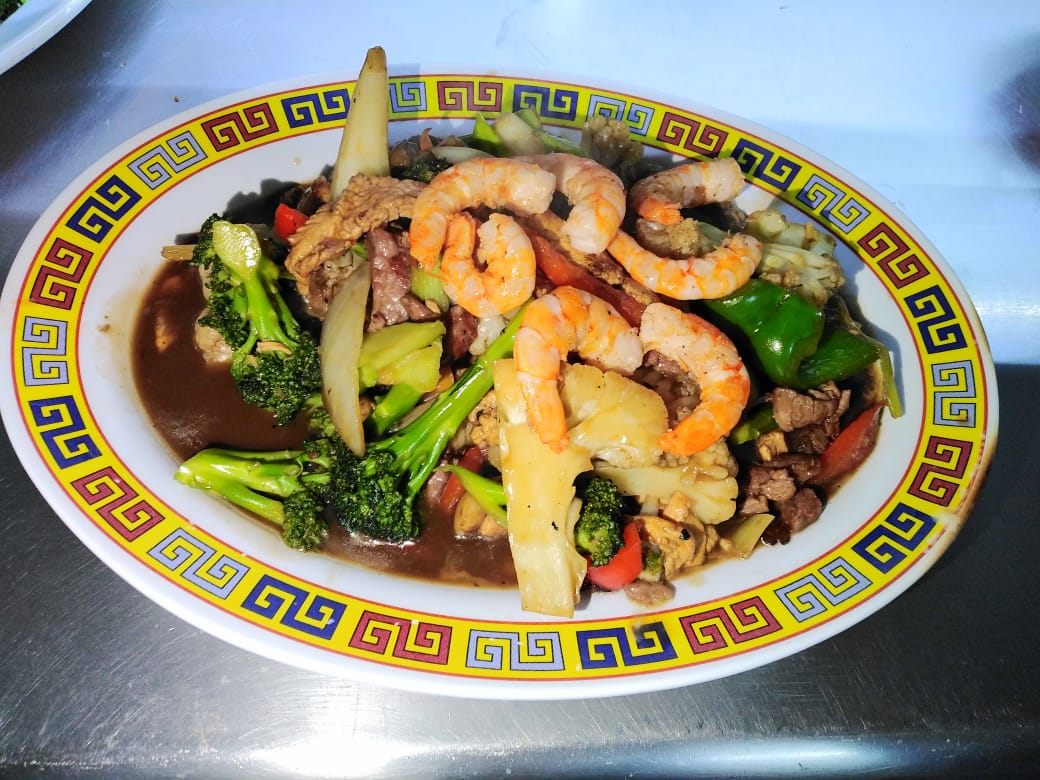 Exquisita mezcla de Res, Pechuga de Pollo fileteada y camarón con verduras selectas: brócoli, coliflor, champiñones, hongo oreja de ratón, elotito tierno, castaña de agua, pimiento morrón, apio y cebolla sazonado con salsa de soya.