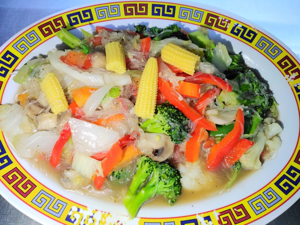 Fideo de soya transparente de frijol de soya con apio, cebolla, zanahoria, brócoli, coliflor, champiñones, elotito tierno, castaña de agua y hongo chino con pollo, res o cerdo.