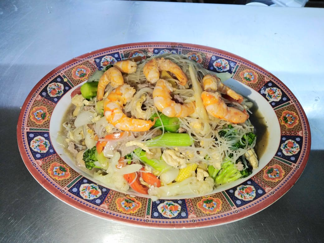 Uno de los Platillos preferidos por todos. Delicada combinación de Proteínas y verduras: Pollo, Res, Camarón, Brócoli, Coliflor, Pimiento Morrón Verde, Elotitos, Champiñón Chino, todo guisado con nuestra salsa especial picosita y montado sobre una base de Fideo de Soya Frita.