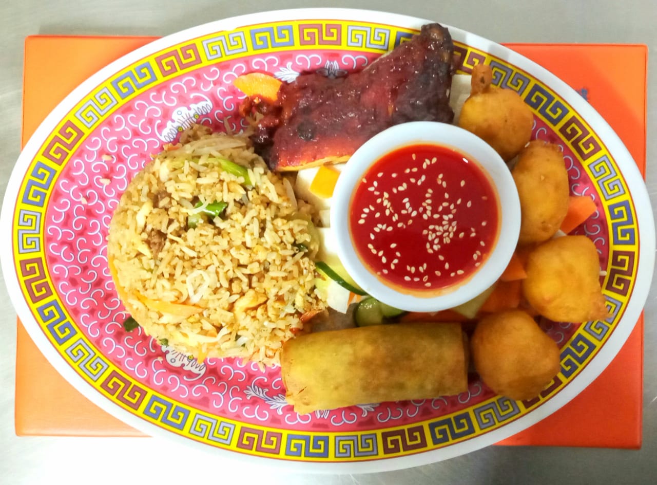 Nuestro Paquete Especial: un Rollo Primavera, una Costilla al Horno cuatro piezas de Pollo Agridulce y 250 grs de Chau Fan Kowloon.