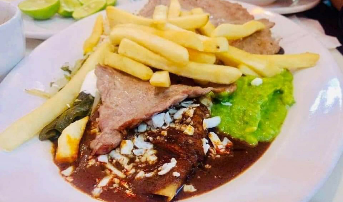 Deliciosas Enchiladas de Mole de la Casa (3) rellenas de Pollo acompañadas con Arroz.