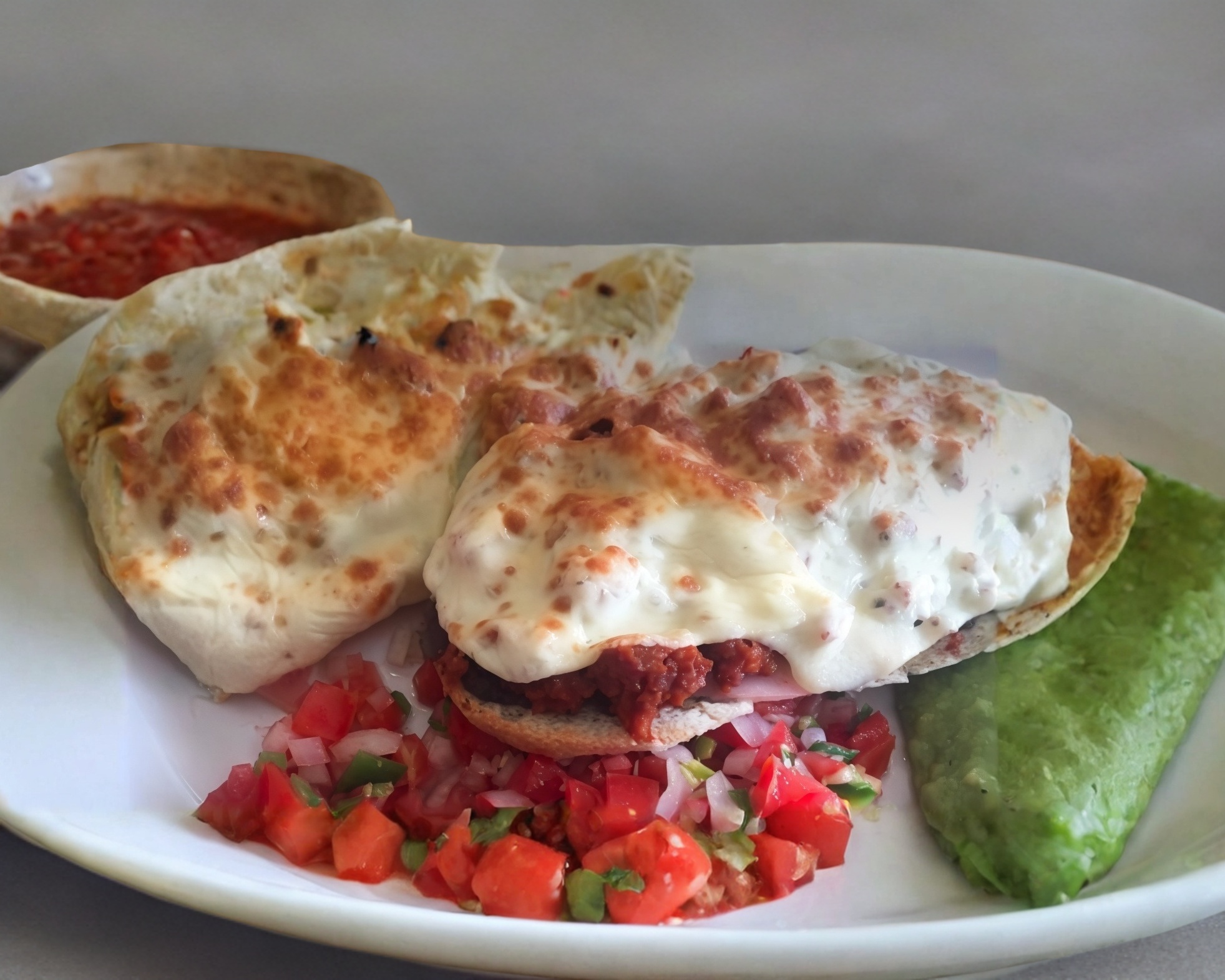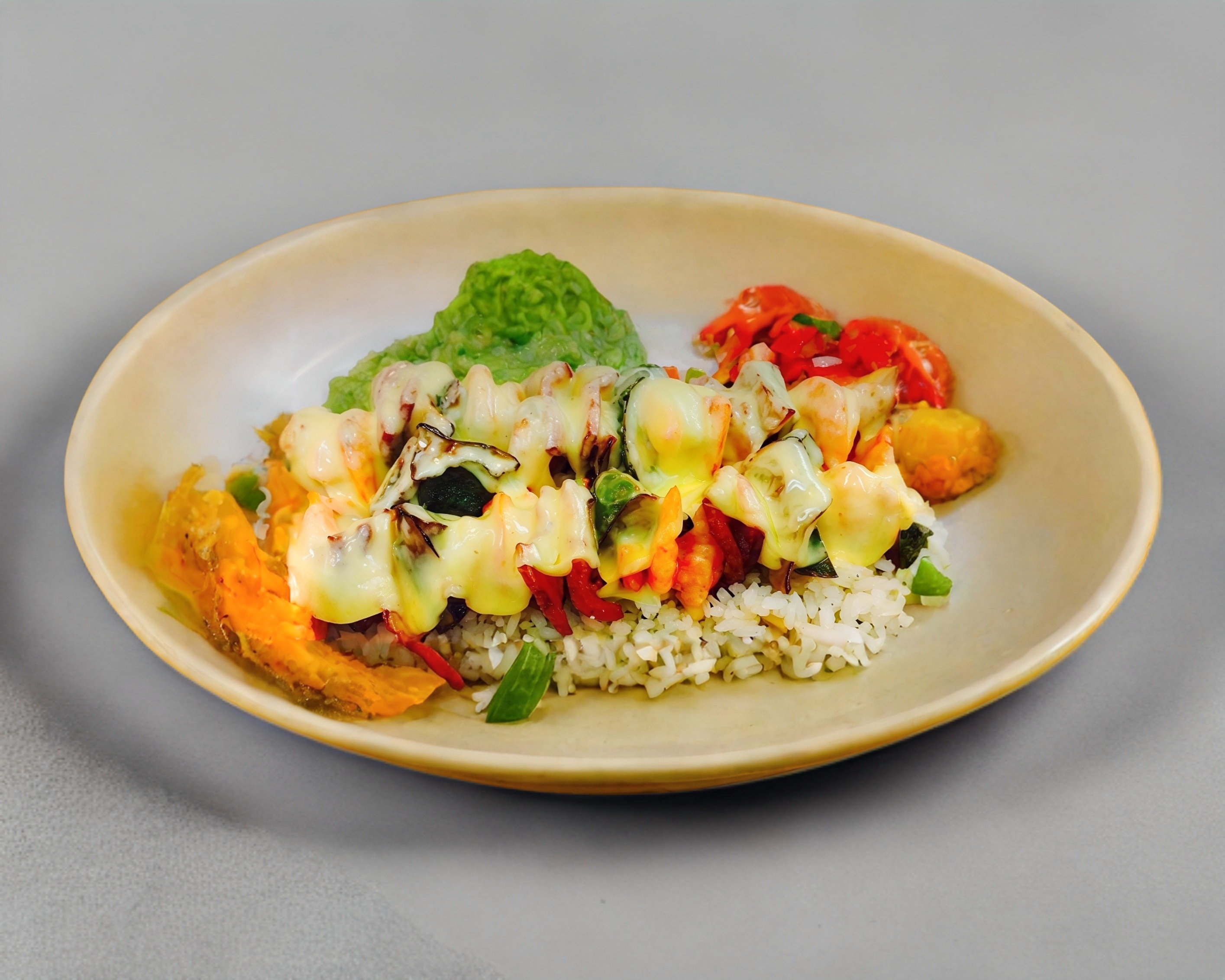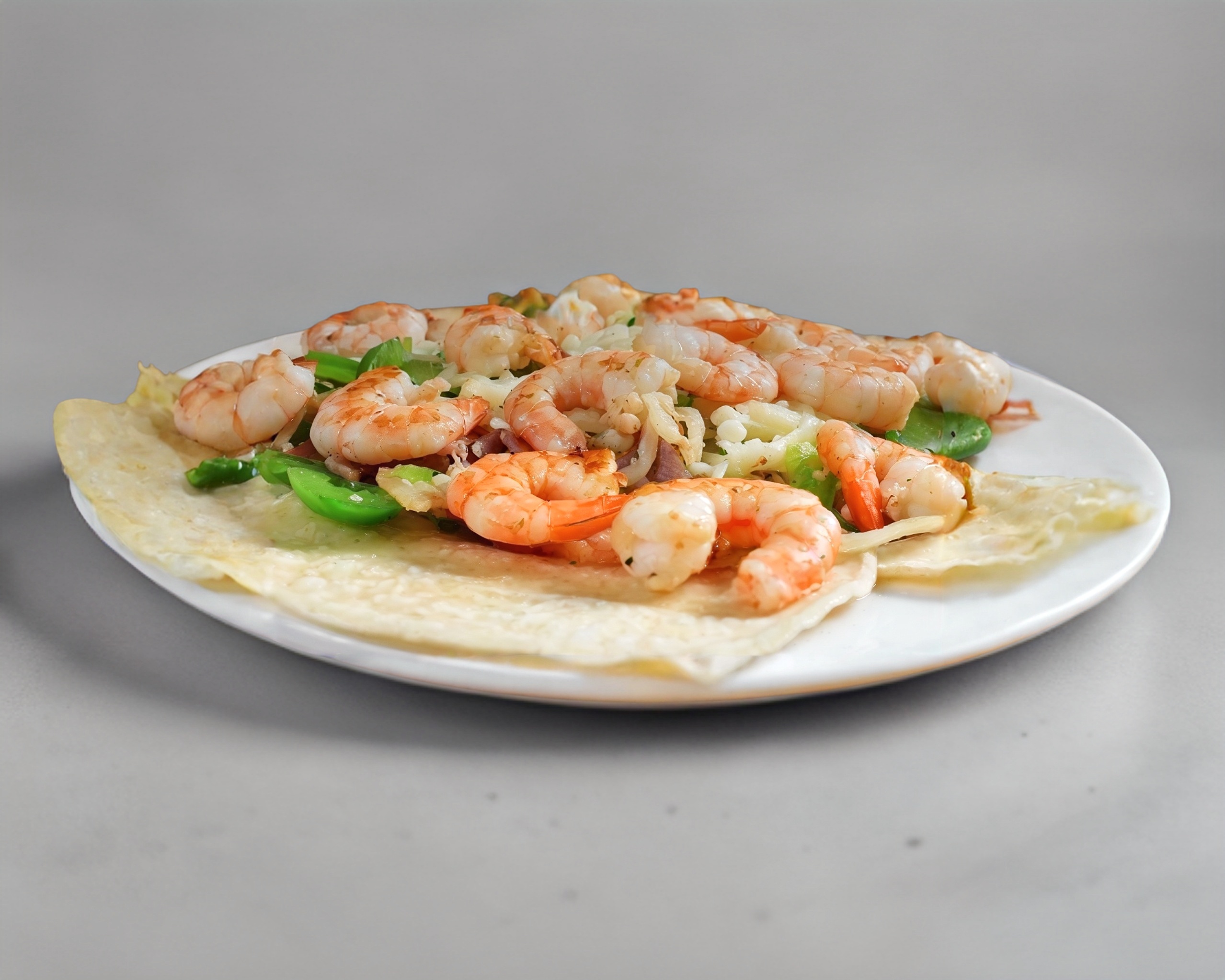Camarón pacotilla, pimiento morron, tocino, cebolla, cortado en mirepoix, gratinada con queso manchego, acompañada de guacamole, pico de gallo, y 3 tortillas de harina.