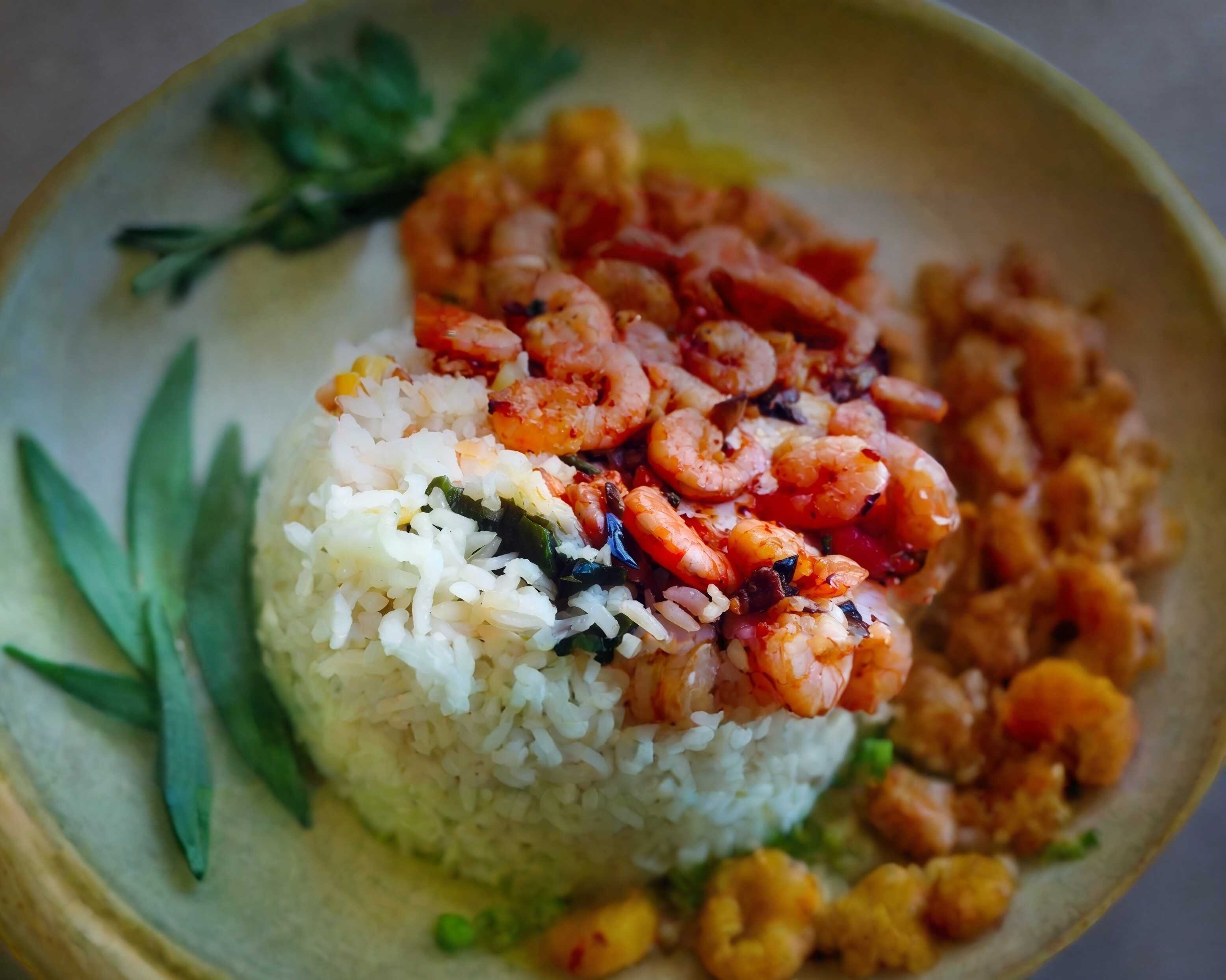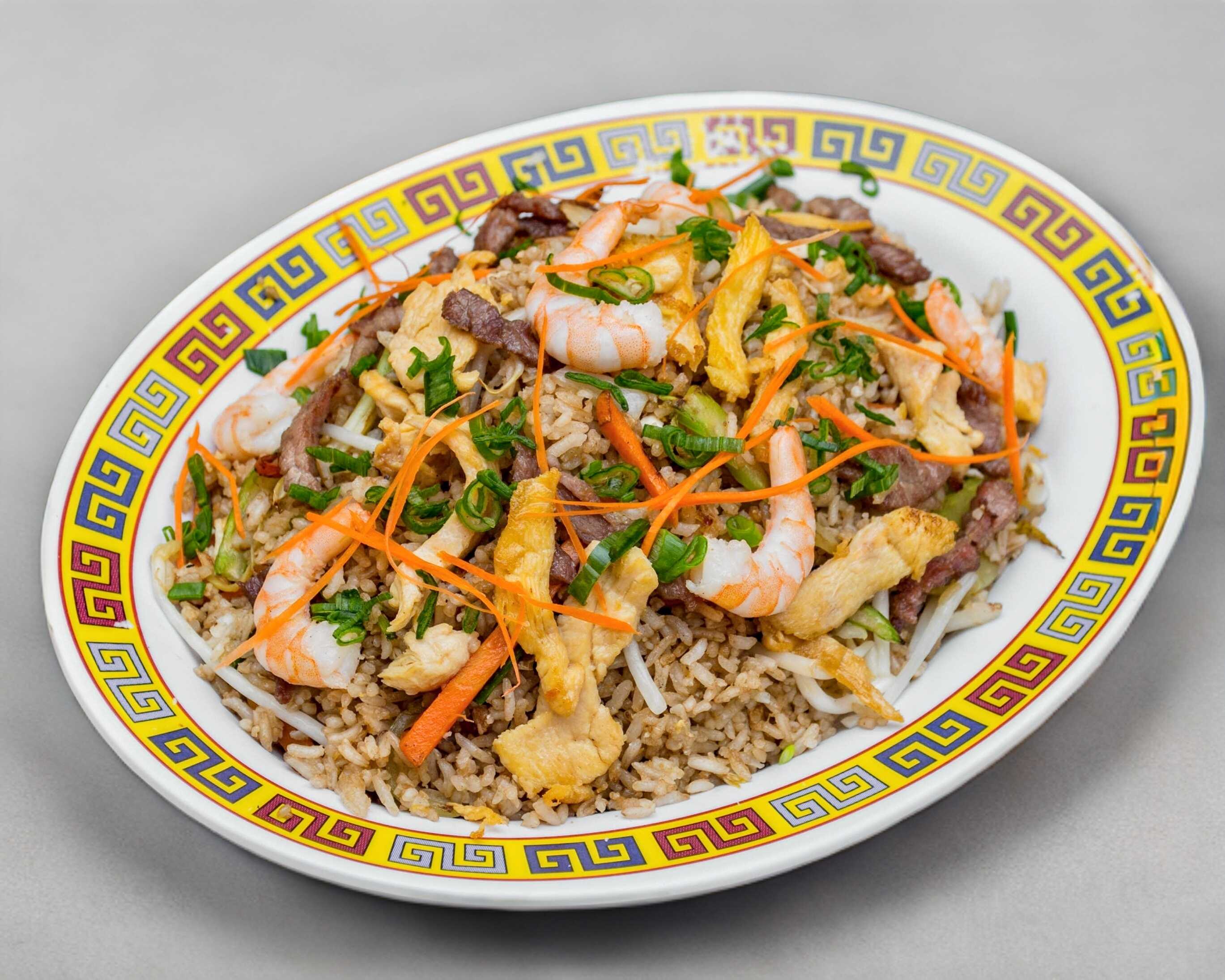 Nuestro clásico arroz frito con pollo, res y camarón preparado con un toque de germen de soya, apio, cebolla, zanahoria, cebollín y huevo.