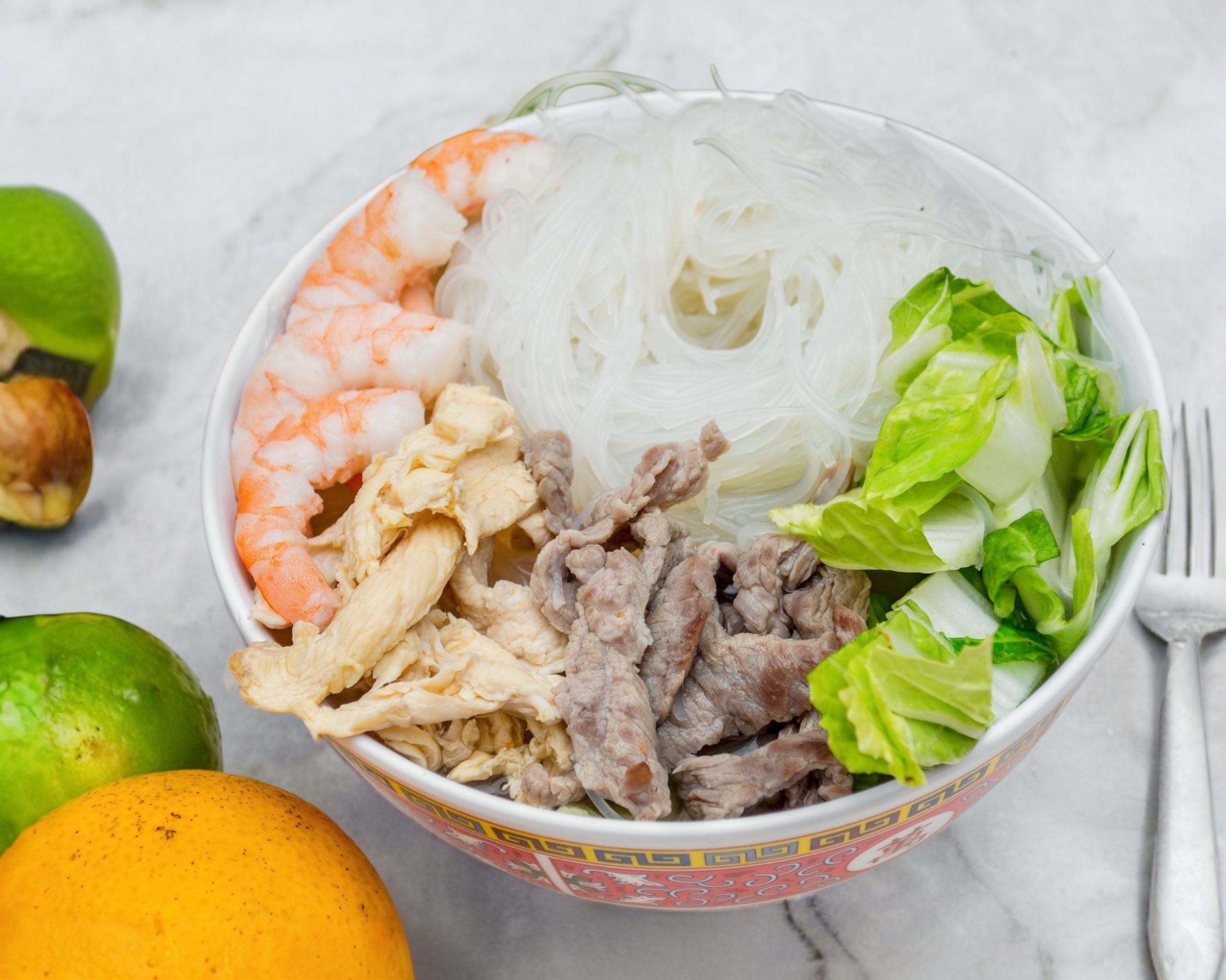 Fideo transparente de soya, pollo, res y camarón, chicoria, fondo de pollo, y un toque de aceite de ajonjolí. (34oz)