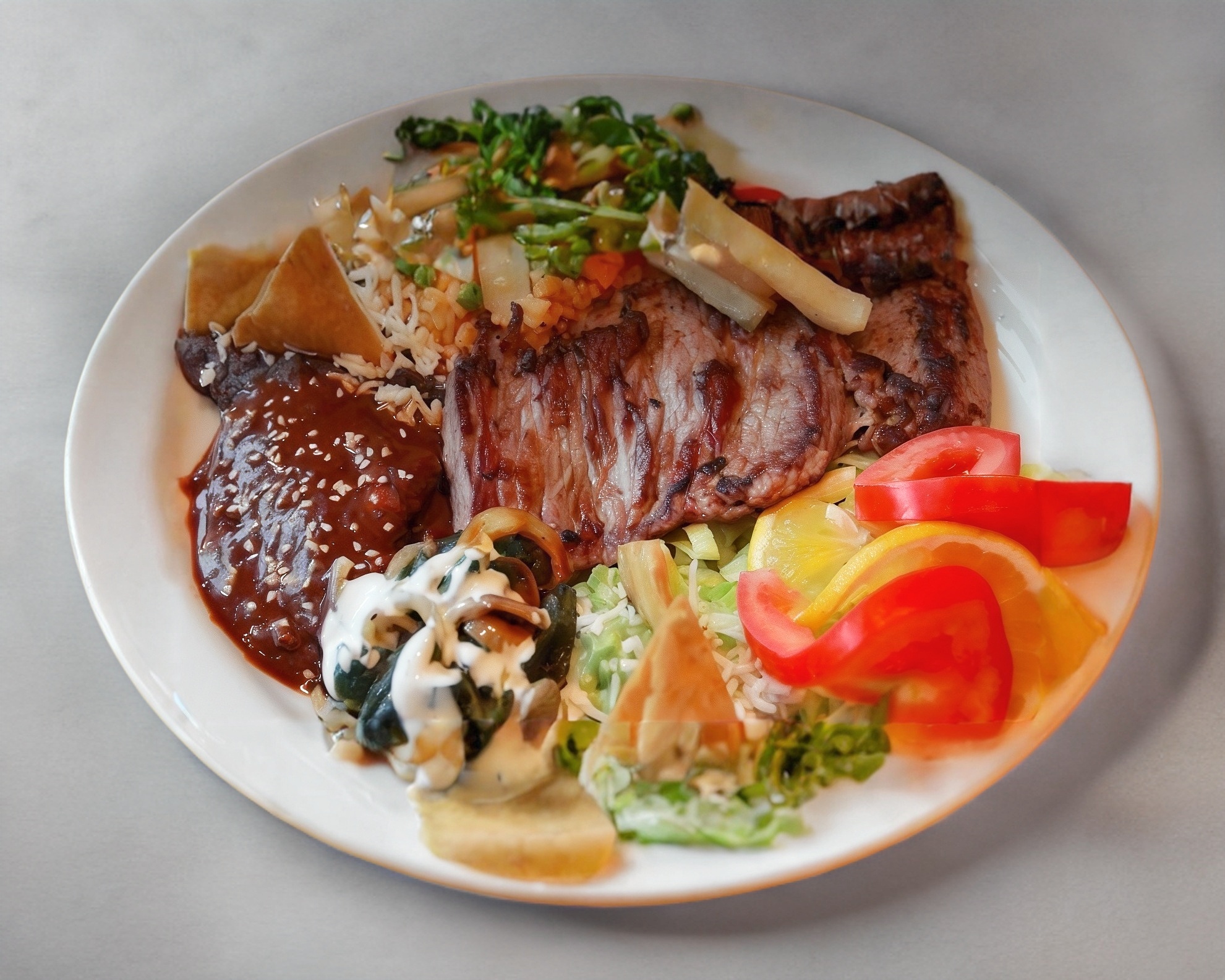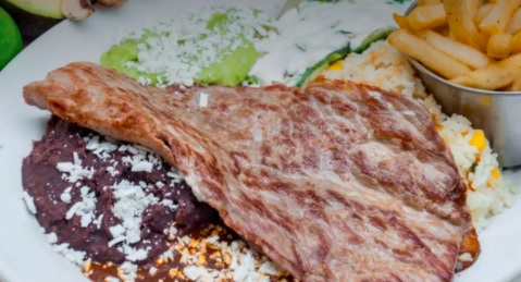 200g Bisteck acompañada de 1 enmolada, rajas de poblano, arroz, guacamole y papas a la francesa.