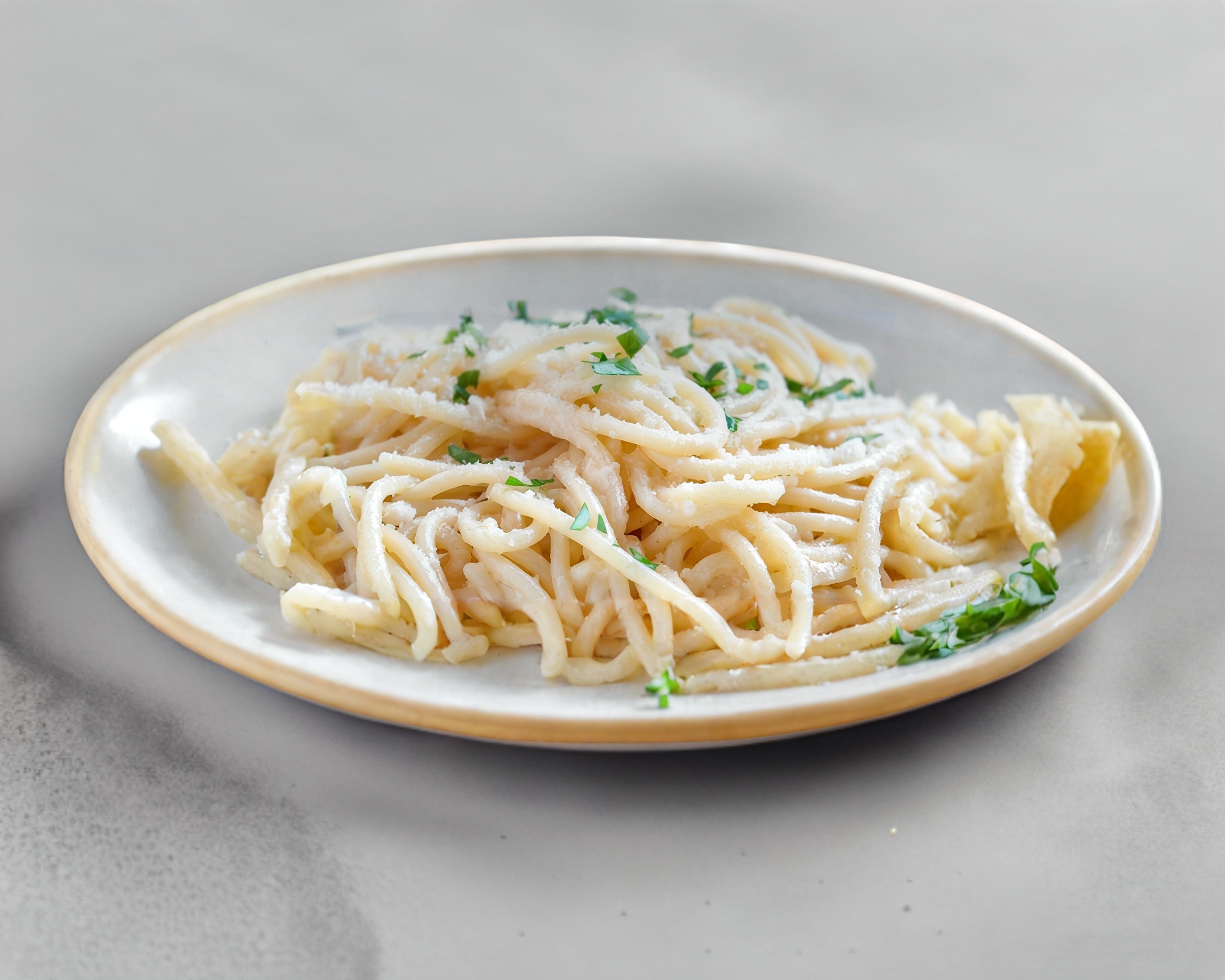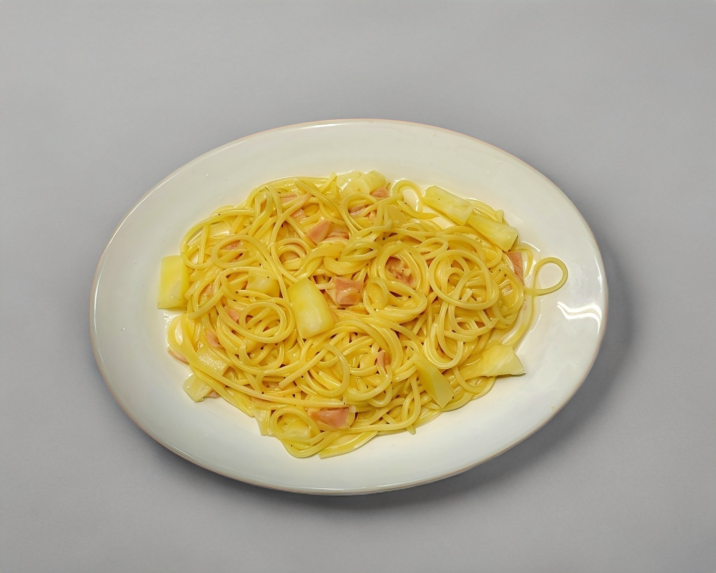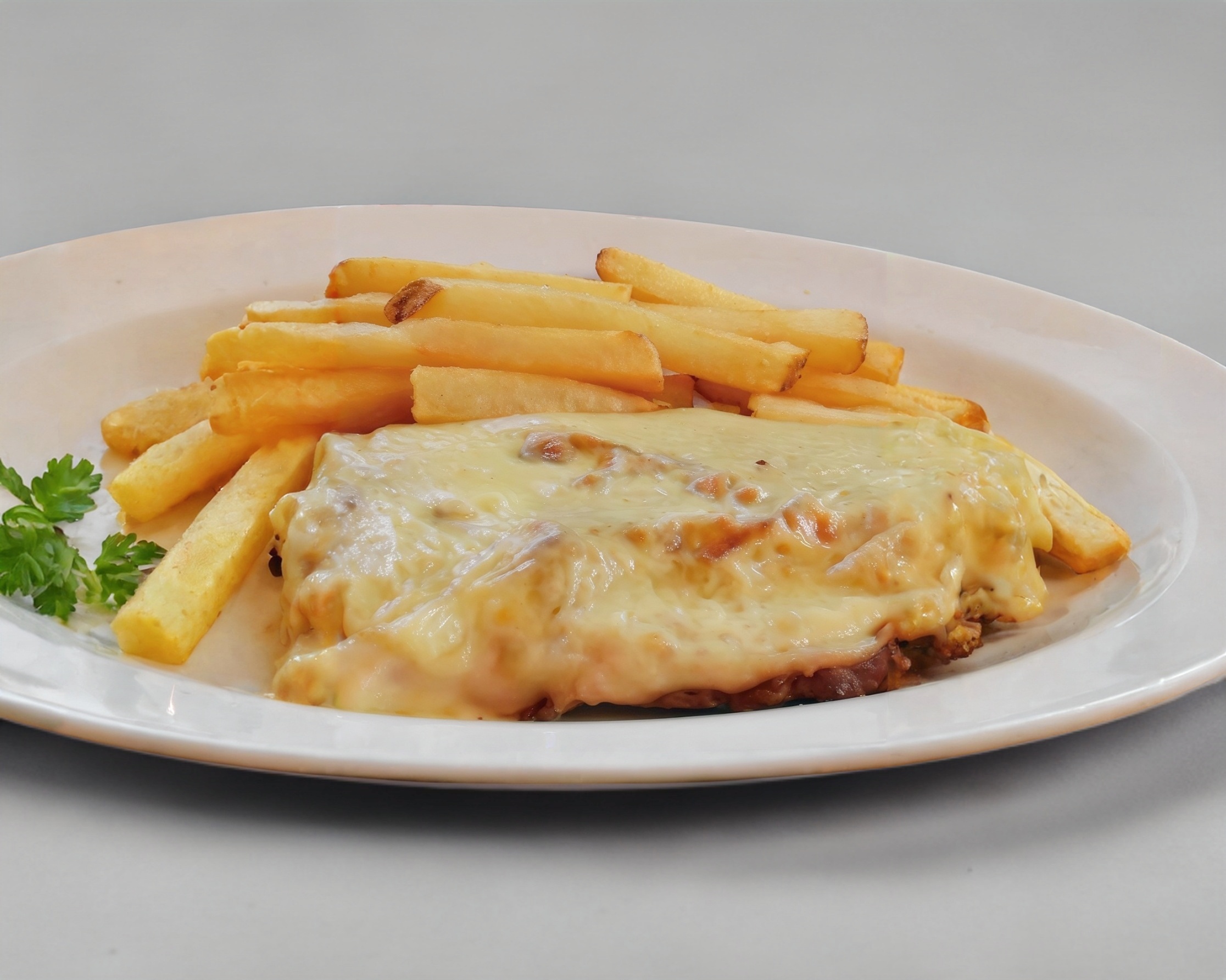 Pechuga empanizada, gratinada con parmesano, sobre un espejo de salsa suiza, acompañada de espagueti a la crema y ensalada rusa.