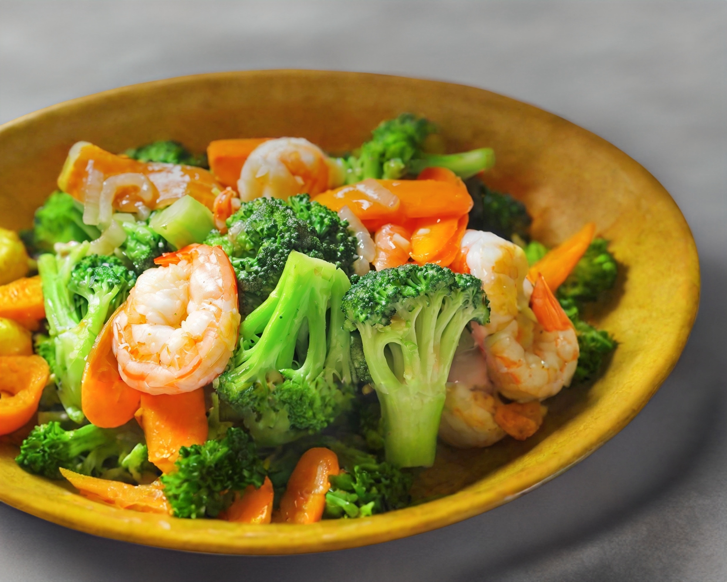 El clásico platillo cantonés de camarones con brócoli, champiñones, elotitos, apio, zanahoria y cebolla sazonado con salsa de ostión.