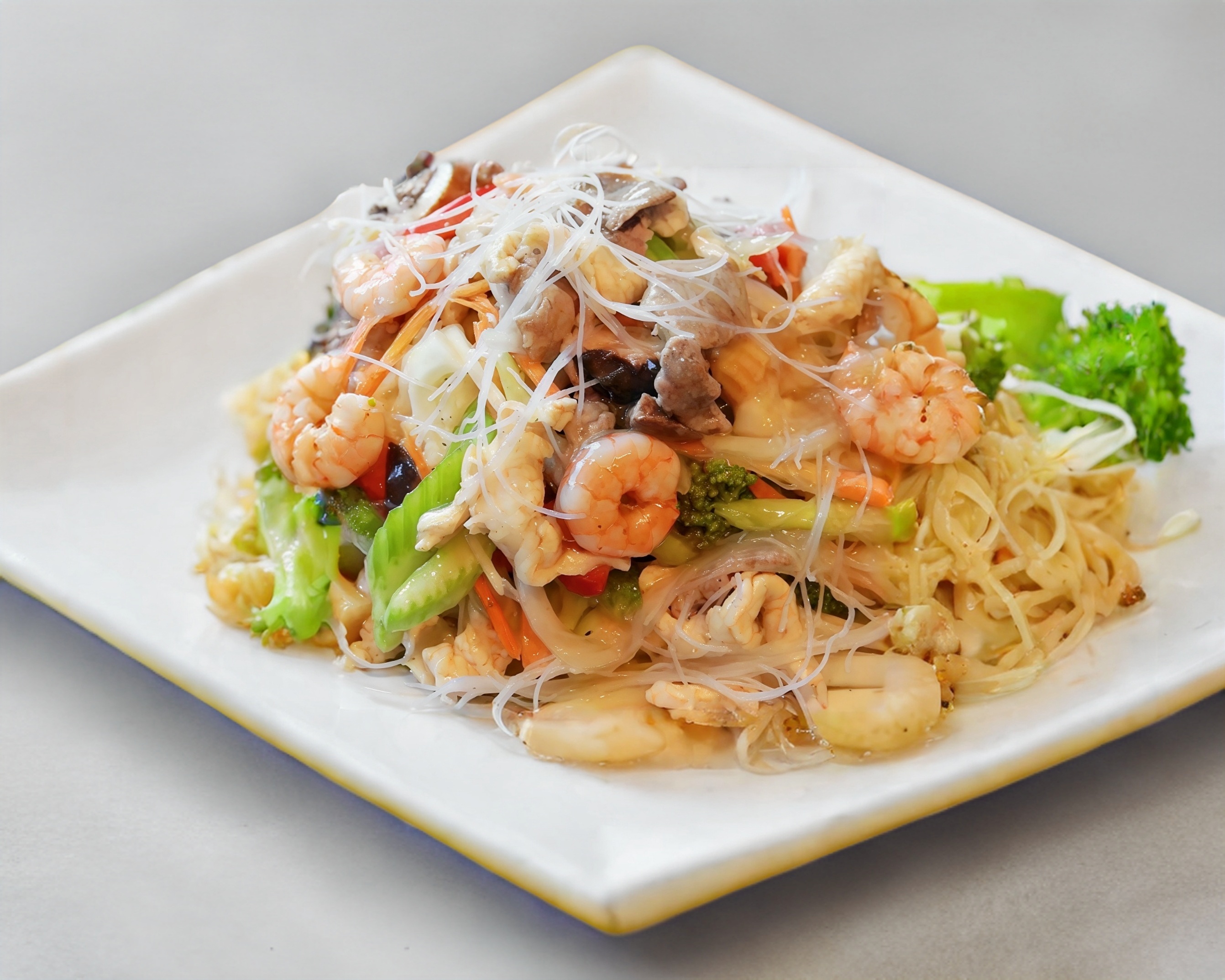 Fideo transparente de soya con apio, cebolla, zanahoria, brócoli, coliflor, champiñones, elotitos, castaña de agua y hongo chino, con camarones, calamares o pescado.