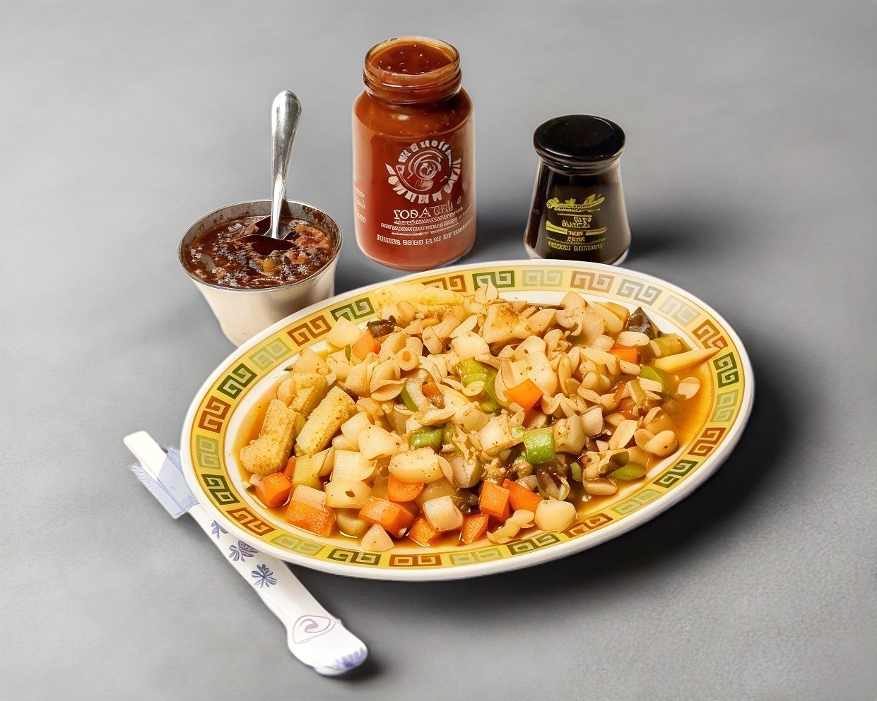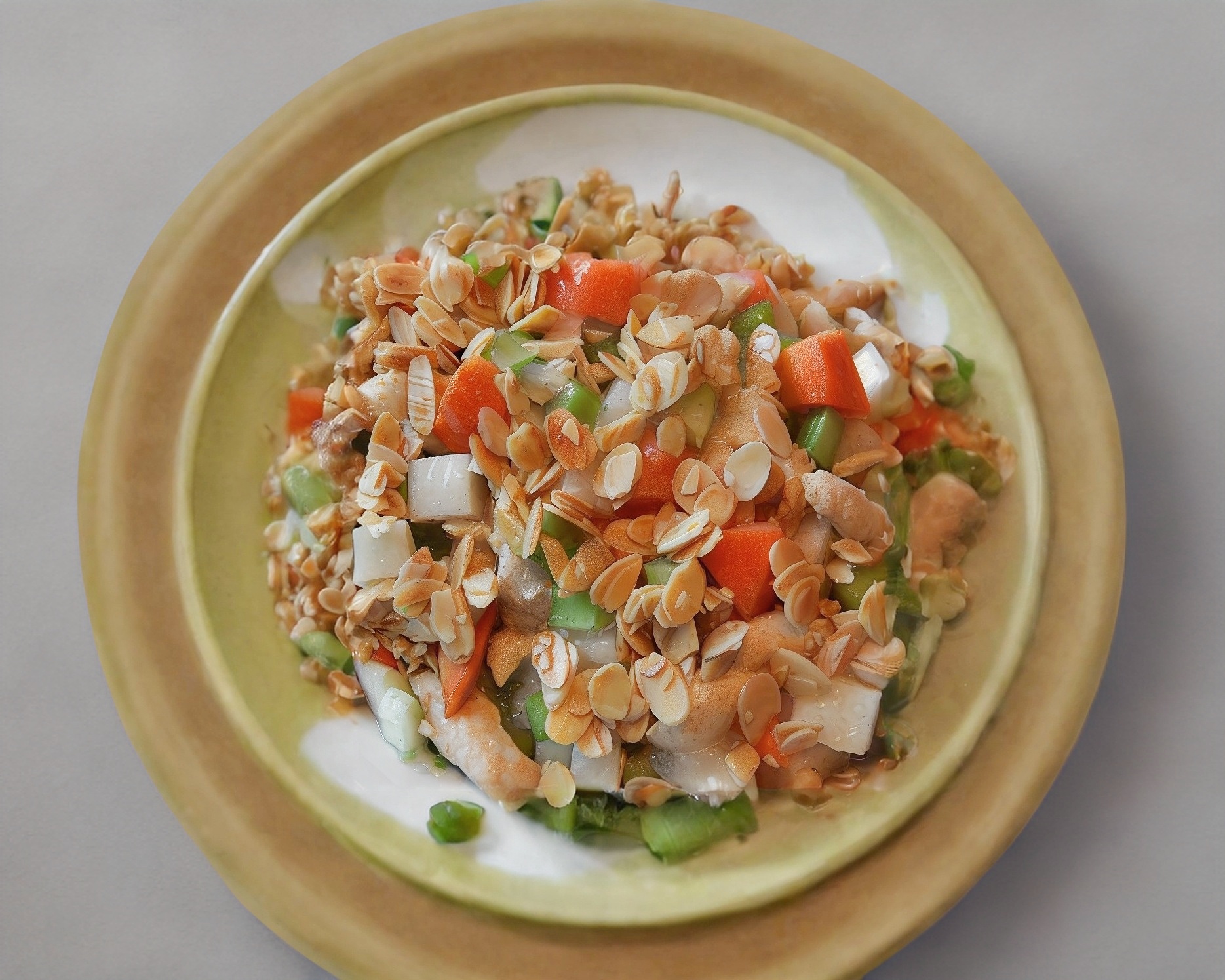 Clásico platillo con cubos de zanahoria, jicama, apio, elotitos y champiñones con almendras crujientes y pollo en su jugo.