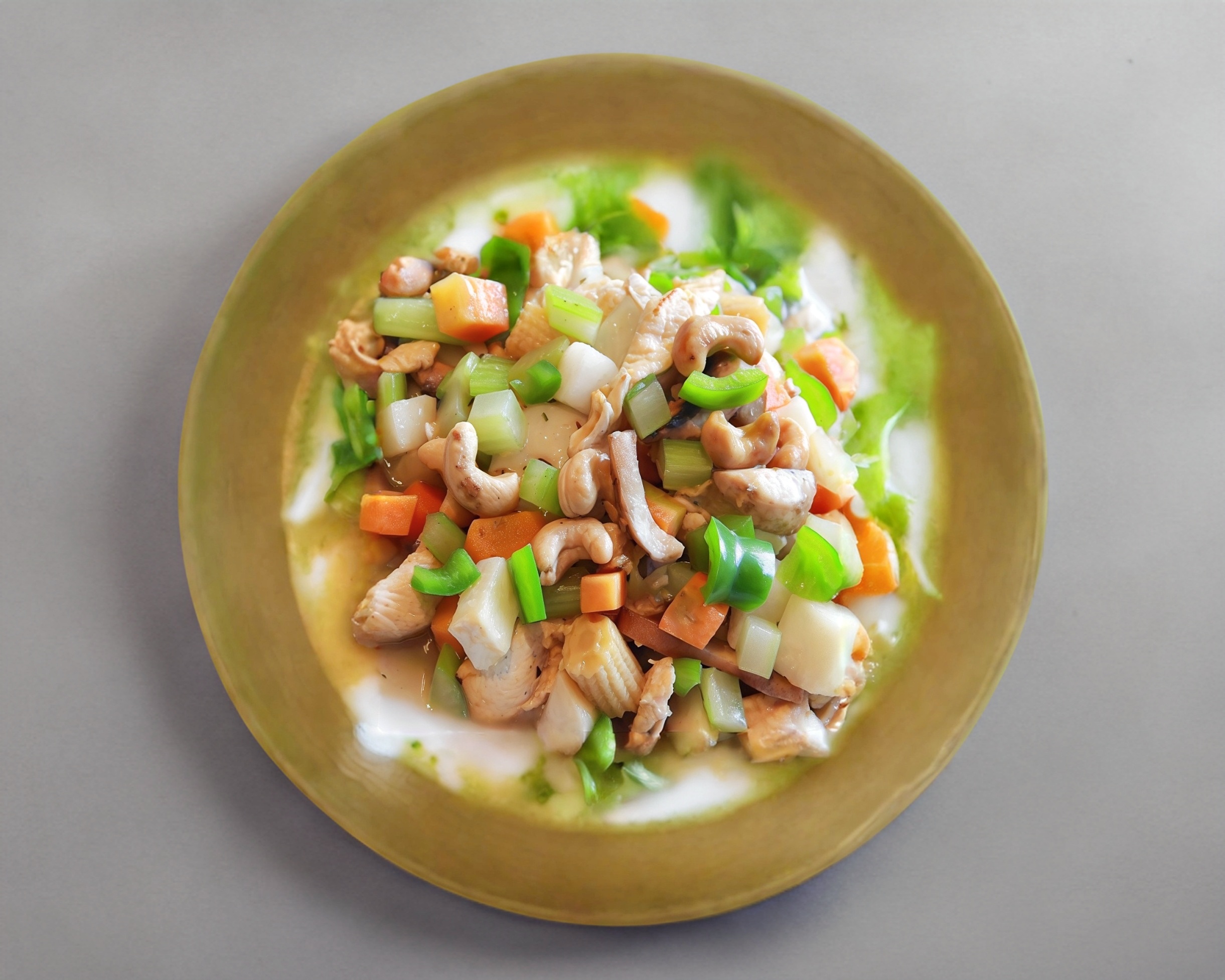 Clásico platillo con cubos de zanahoria, jicama, apio, elotitos y champiñones con crujientes nueces de la india y la proteína de tu preferencia.