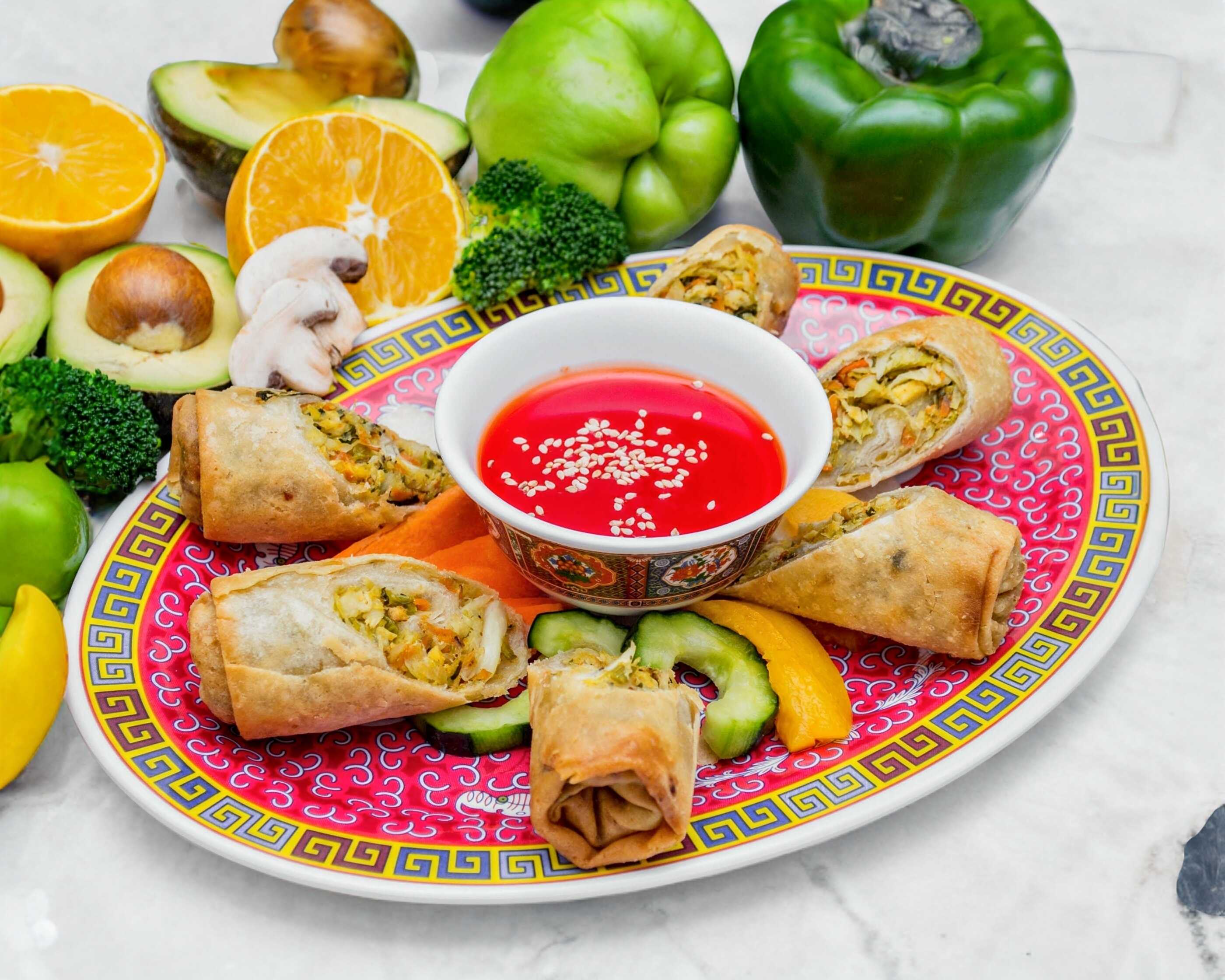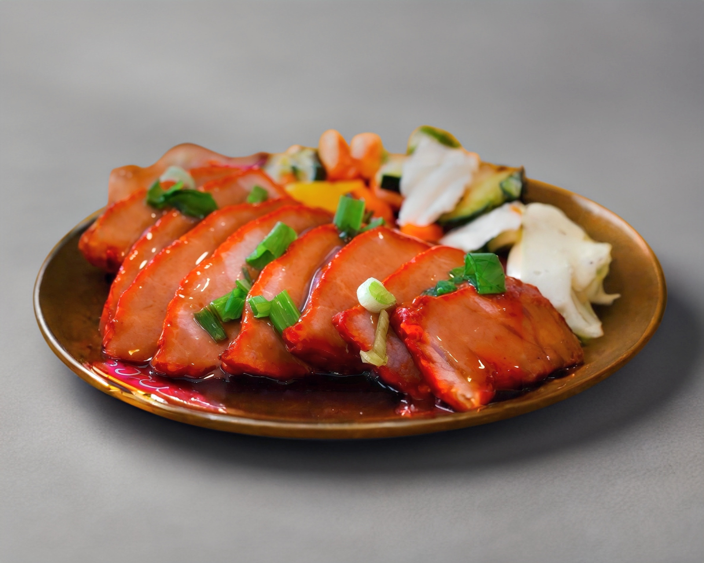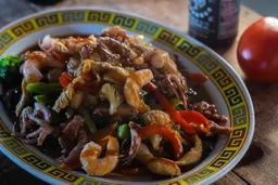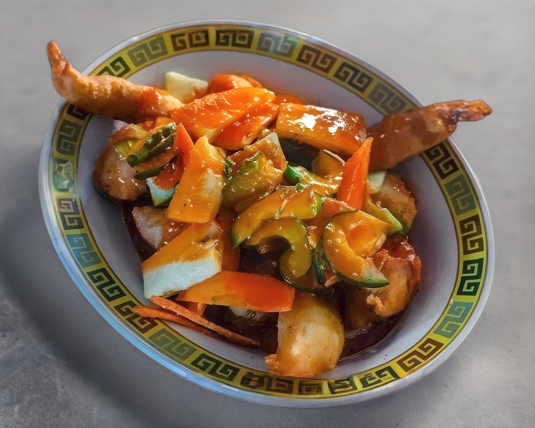 Deliciosa combinación de pollo, cerdo y camarón rebozado sobre una cama de ensalada de verdura china y aderezado con nuestra única salsa agridulce.