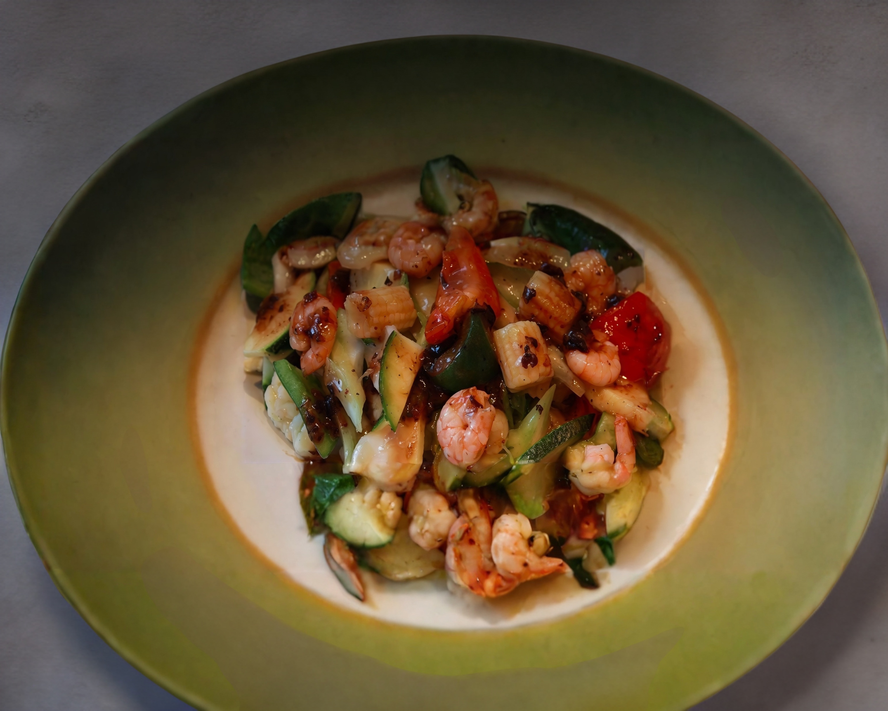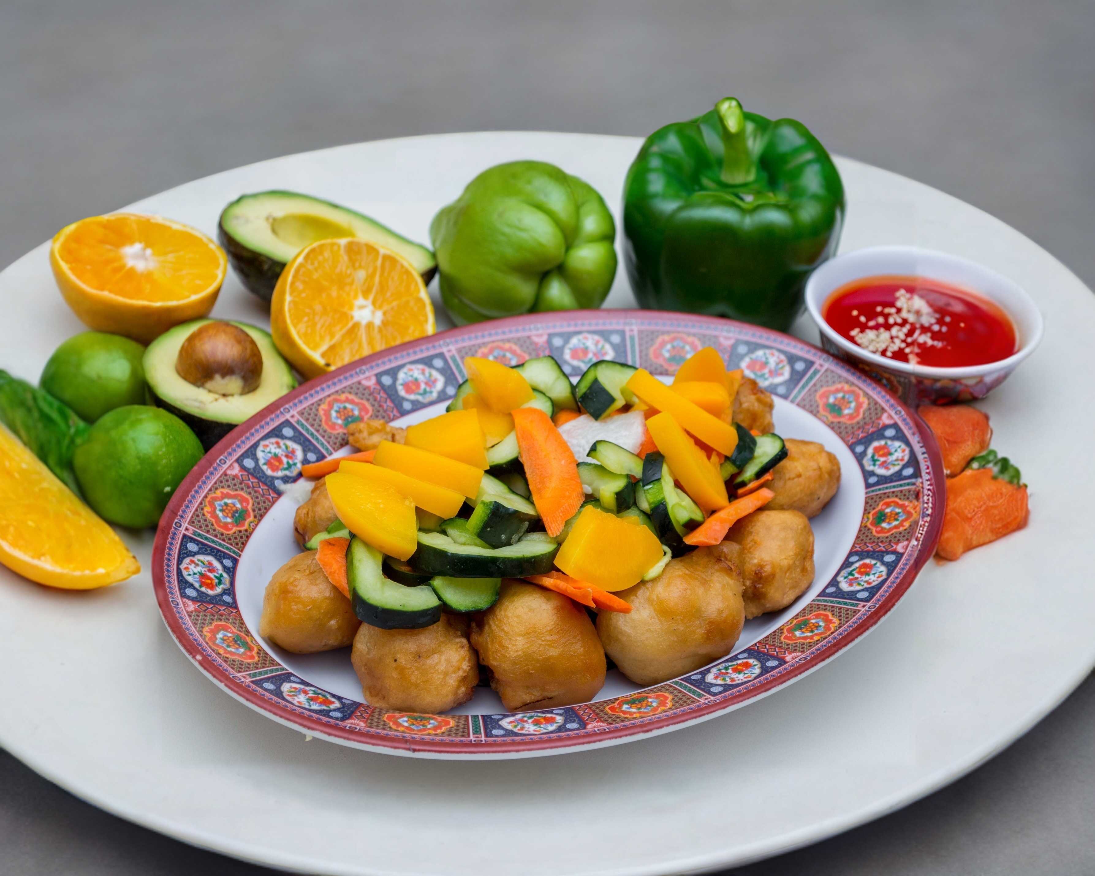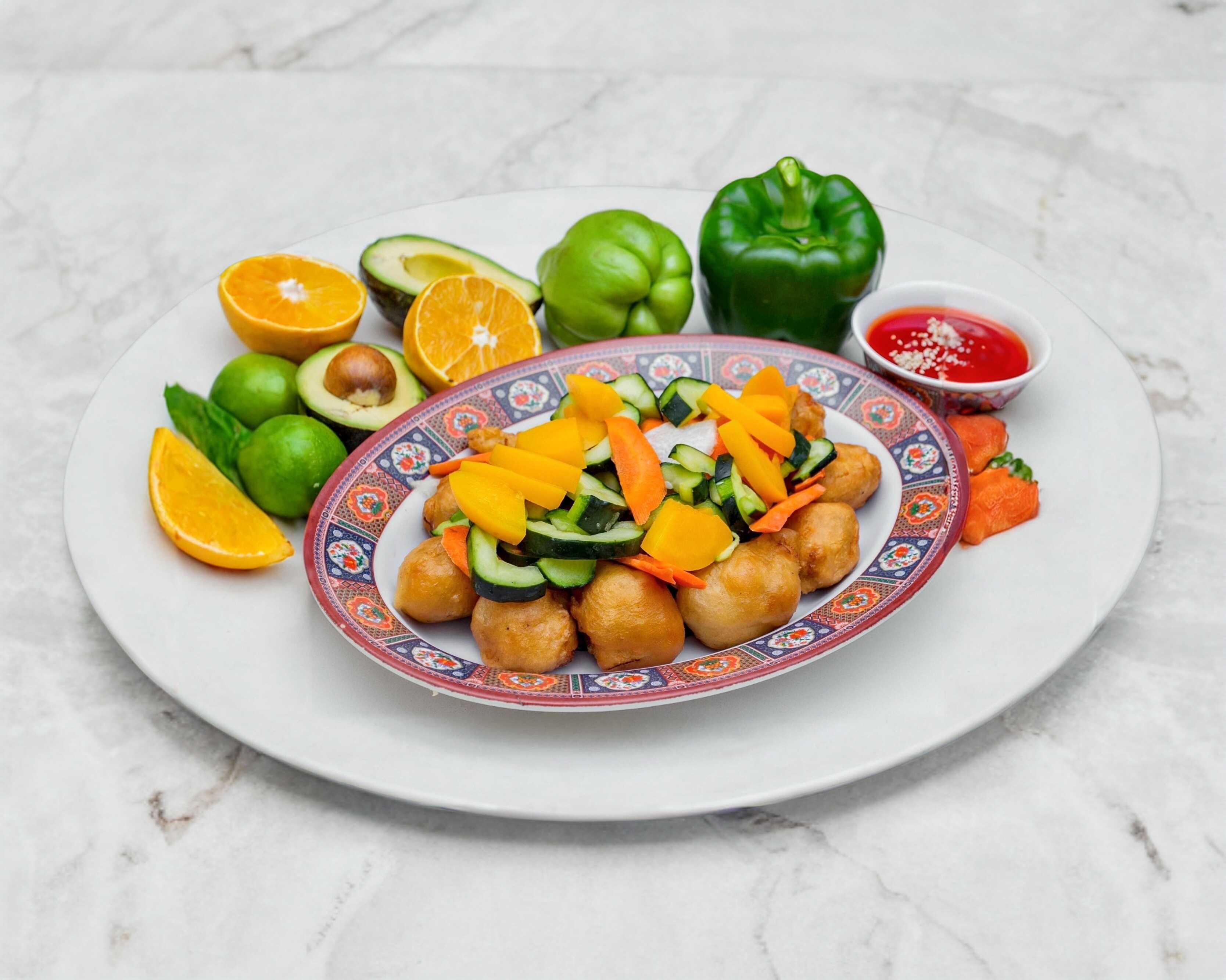 Camarones rebosados acompañada con ensalada de verduras china y aderezado con salsa agridulce.