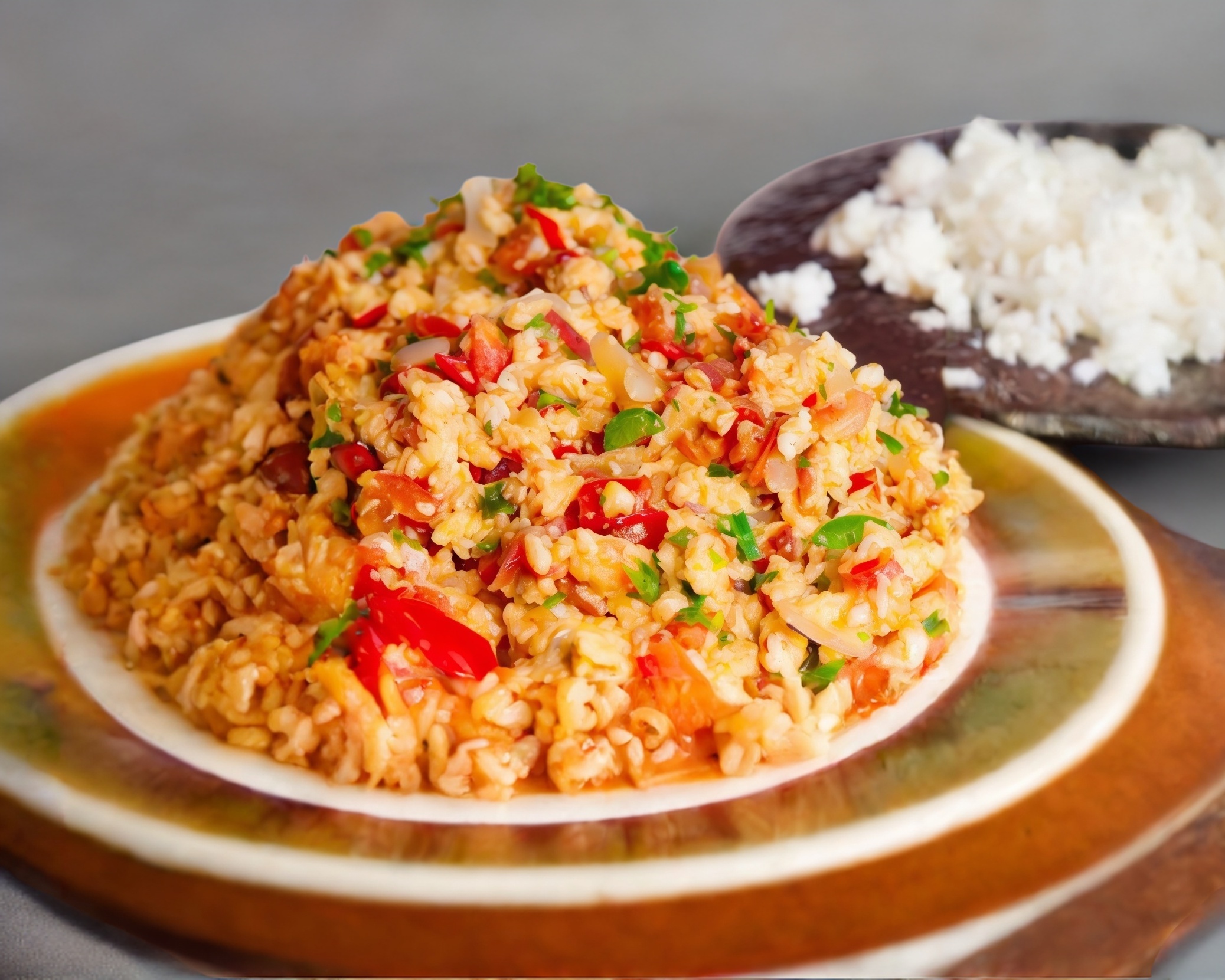 Delicioso arroz frito preparado con huevo, tocino, jamón, apio, cebollín y un toque de germen de soya y cilantro.