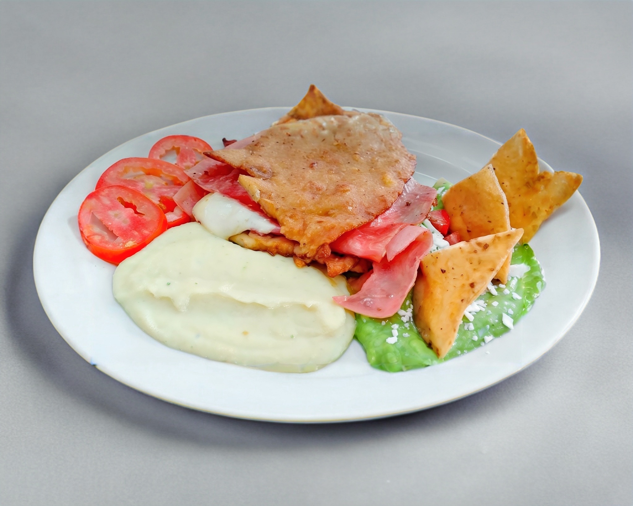 Bisteck de res empanizado, relleno de queso manchego y jamón, acompañado de puré de papa y guacamole.