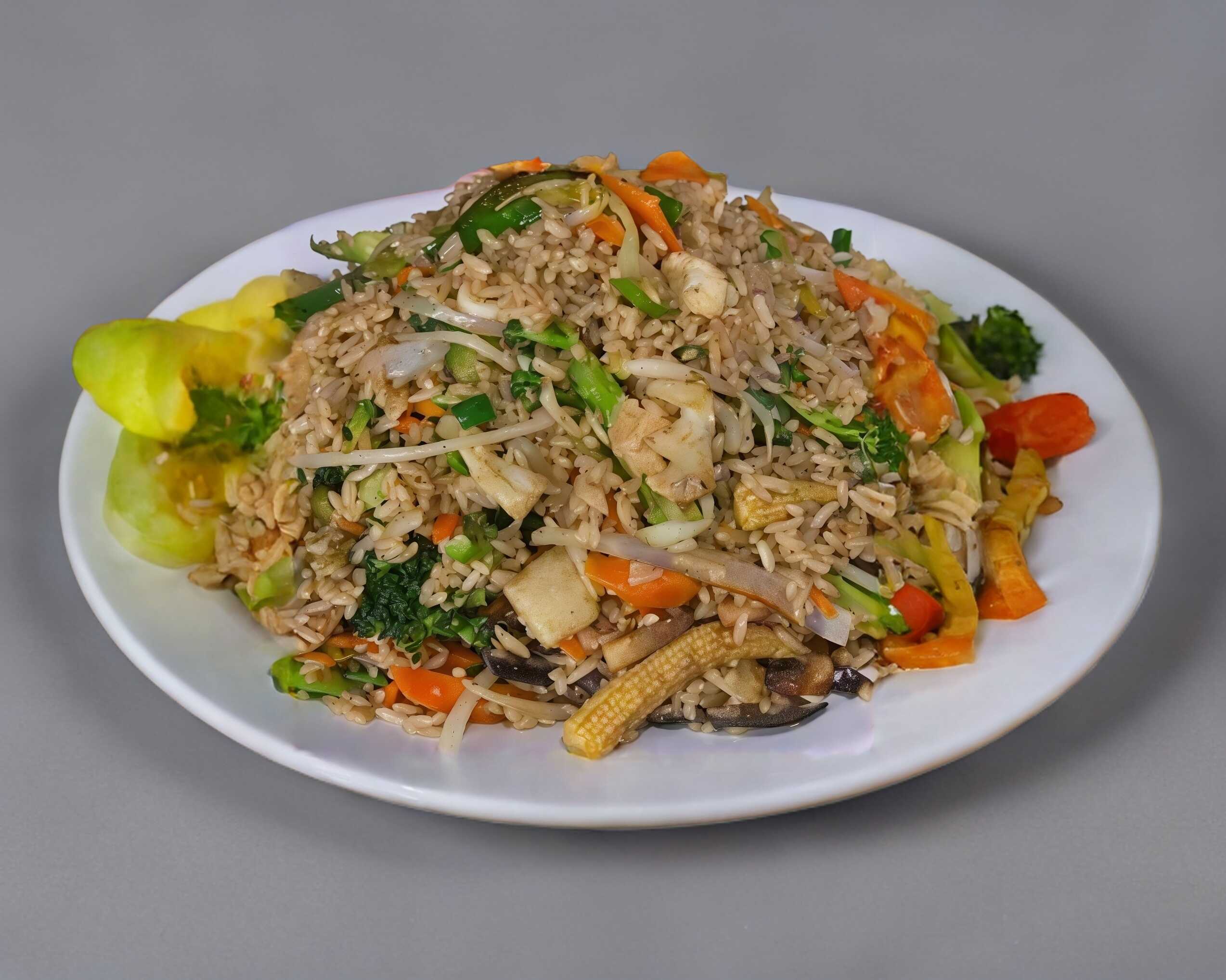 Arroz frito con una combinación de verduras selectas: brócoli y coliflor guisado con un toque de germen de soya, apio, cebolla, zanahoria, cebollín y huevo.