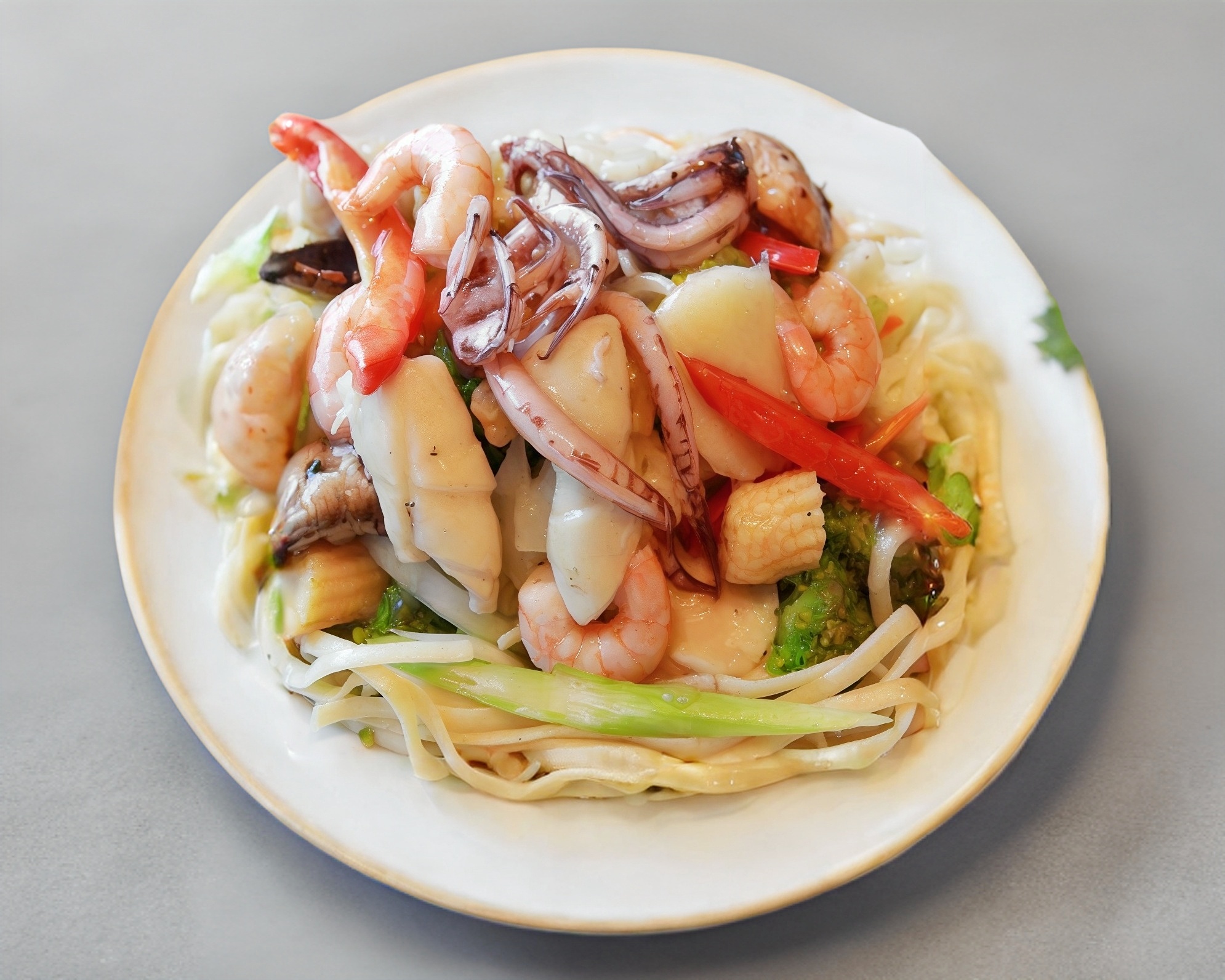Tallarines con apio, cebolla, zanahoria, brócoli, coliflor, champiñones, elotitos, castaña de agua y hongo chino, con camarón, calamar y pescado.